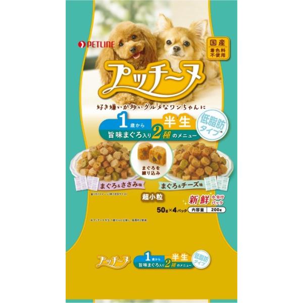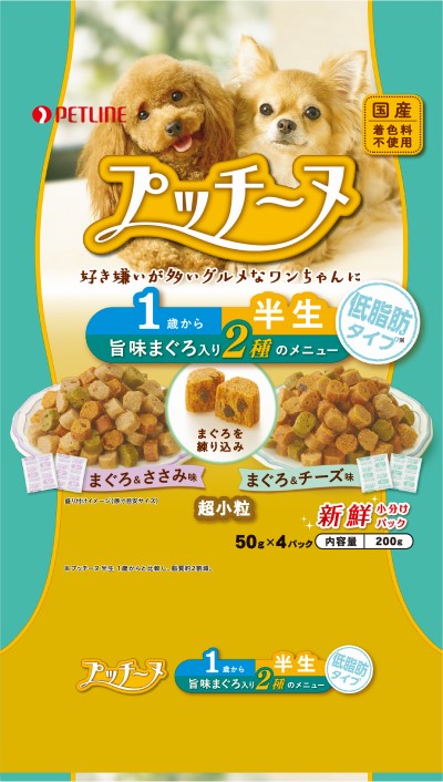 | ペットライン いぬのしあわせ プッチーヌ 1歳から 半生 低脂肪タイプ 旨味まぐろ入り 2種のメニュー まぐろ&ささみ味 まぐろ&チーズ味 超小粒 200g | |