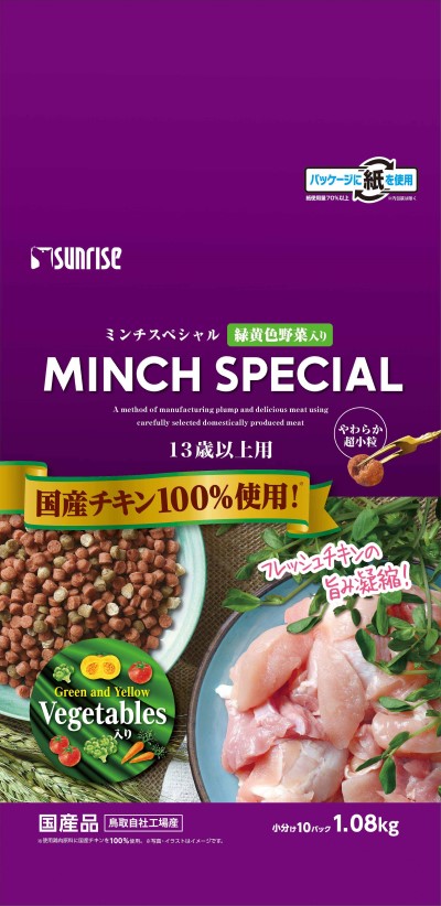 | サンライズ ミンチスペシャル 13歳以上用 国産チキン100%使用 緑黄色野菜入り やわらか超小粒 1.08kg | |