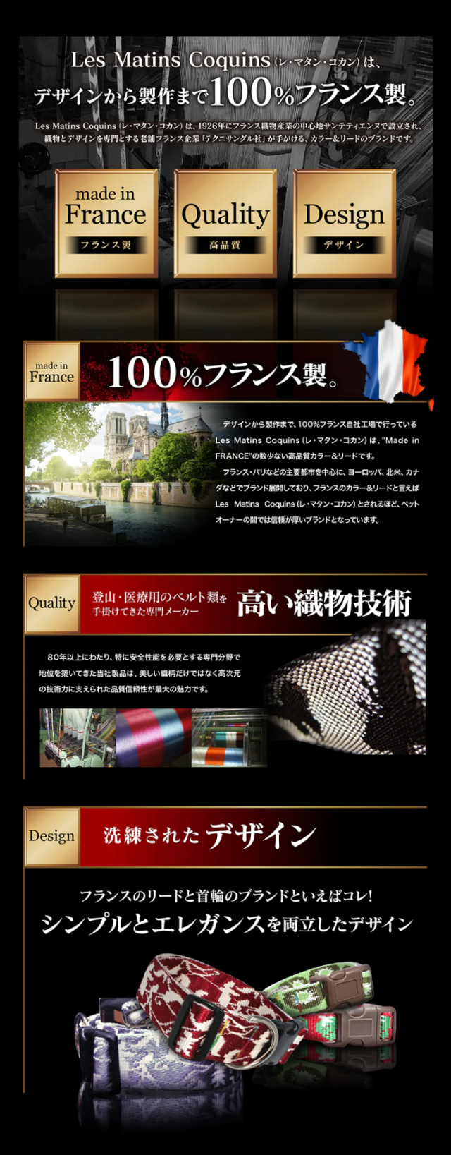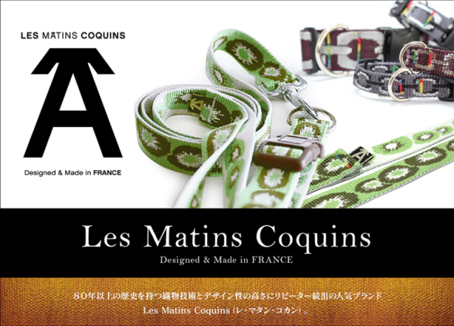 LES MATINS COQUINS(レ・マタン・コカン)の首輪・リード・ハーフチョークは、織物とデザインを専門とする老舗フランス企業「テクニサングル社」がデザインから製造まで全工程をフランスで行う数少ない”Made in FRANCE”の製品です。フランスはもとより、ヨーロッパ、カナダ、アメリカなど、全世界のドッグ&キャットオーナーに愛されています。もともと登山用や医療用のベルト類などプロフェッショナル向け製品を手掛けてきた同社は、90年以上の歴史の中で技術開発力と製造品質を磨き続け、レ・マタン・コカンの製品にも余すことなく活かされています。