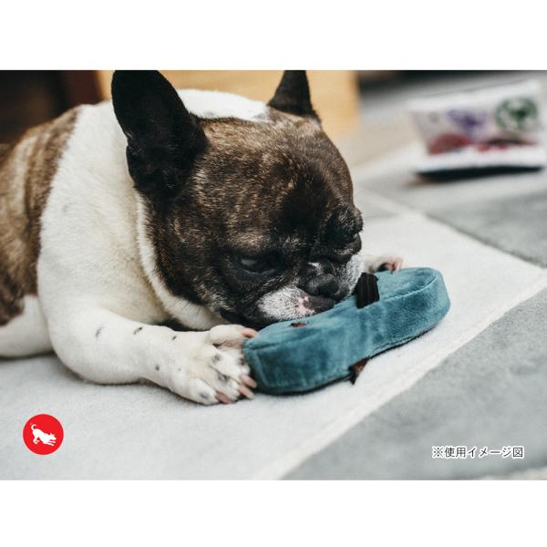 ベロア製で肌触りがよく、ワンちゃんの興味を惹きつける音も鳴ります。形や触り心地だけではなく、作り方にもこだわっており、子供用品と同等の品質基準で生産しています。少しでも丈夫な作りにするために、生地は2枚重ねにし、縫い目もダブルステッチ(2度縫い)を手作業でしています。