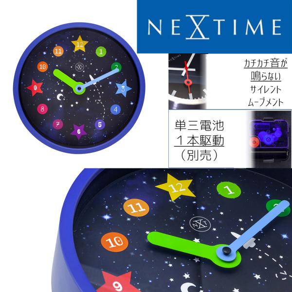 オランダ生まれの時計ブランド『NexTime(ネクスタイム)』の壁掛け時計です。青いケースにカラフルな星々、夜空をファンシーに表現した掛け時計です。もちろん、ロケットも描かれています! 針も先端が丸く加工されていて、全体的に可愛い印象を与えます。子供部屋や寝室などのインテリアはもちろん、ギフトとしても最適な一品です。