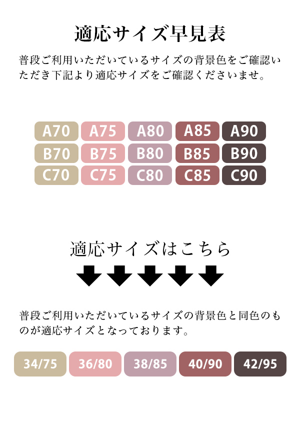 34/75(A70,B70,C70対応) 36/80(A75,B75,C75対応) 38/85(A80,B80,C80対応) 40/90(A85,B85,C85対応) 42/95(A90,B90,C90対応) |