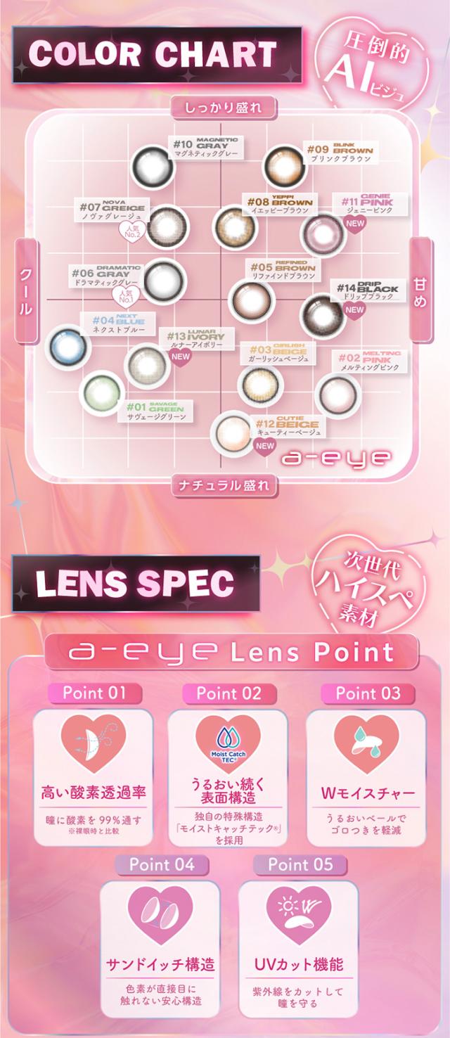 | DIA | 14.0mm:キューティーベージュ/ルナーアイボリー/ドリップブラック/サヴェージグリーン/メルティングピンク/ガーリッシュベージュ/ネクストブルー 14.5mm:ジェニーピンク/ブリンクブラウン/マグネティックグレー/ノヴァグレージュ/イエッピーブラウン/リファインドブラウン/ドラマティックグレー |