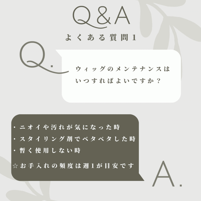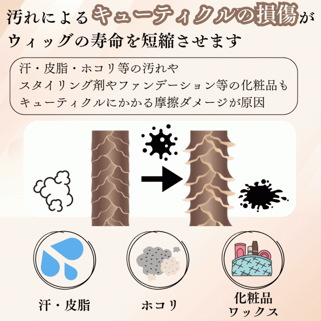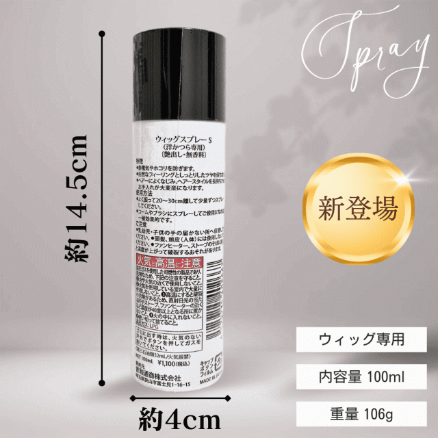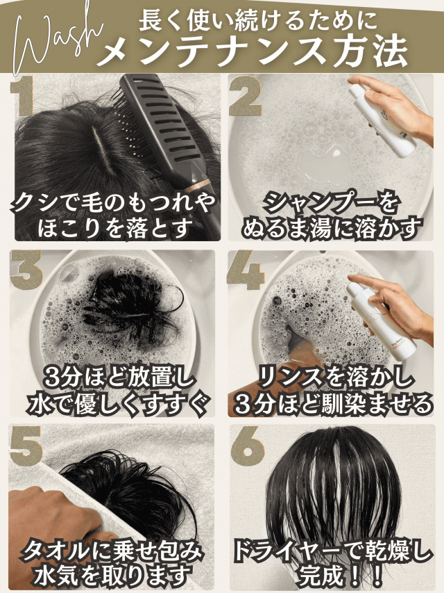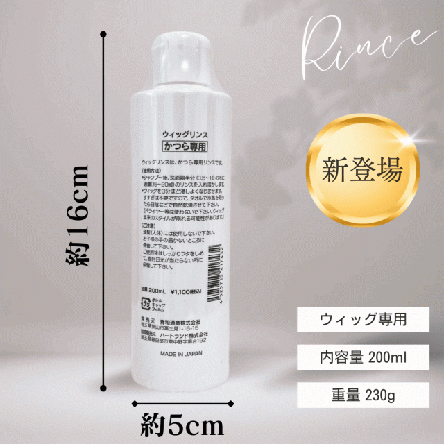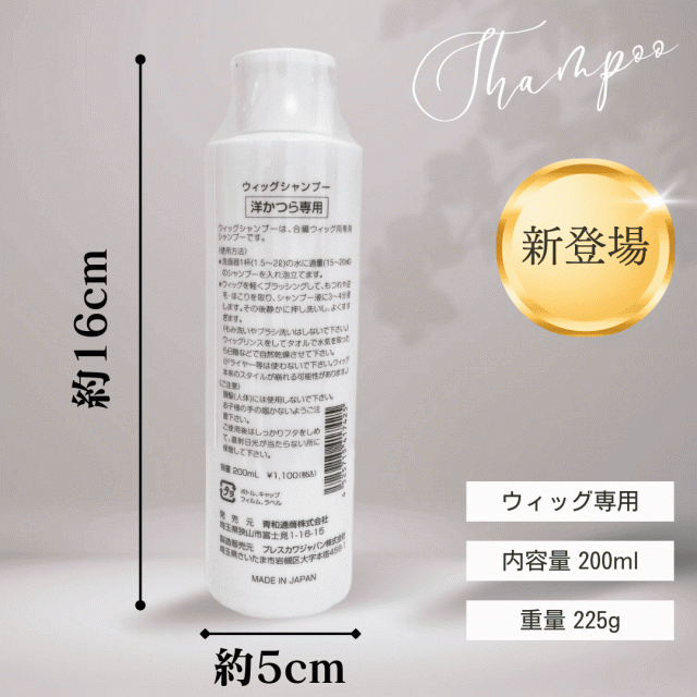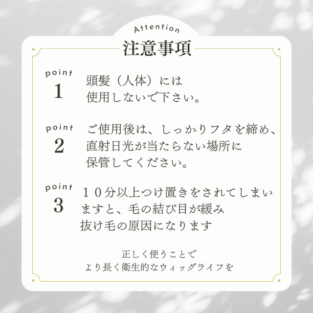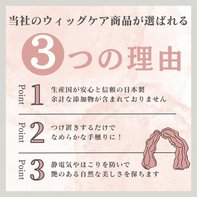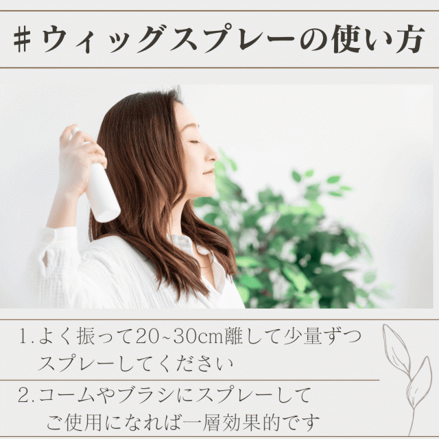 シャンプー / 洗面器一杯(1.5〜2L)の水に適量(15〜20mL)のシャンプーを入れ泡立てます。ウィッグを軽くブラッシングして、もつれや逆毛・ほこりを取り、シャンプー液に3〜4分浸します。その後静かに押し洗いし、よくすすぎます。ウィッグリンスをしてタオルで水気を取ったら日陰などで自然乾燥させて下さい。 リンス / シャンプー後、洗面器半分(0.5〜1L)の水に適量(15〜20mL)のリンスを入れ溶かします。ウィッグを3分ほど浸しよくなじませます。すすぎは不要ですので、タオルで水気を取ったら日陰などで自然乾燥させて下さい。 ヘアスプレー / よく振って20〜30cm離して少量ずつスプレーしてください。コームやブラシにスプレーしてご使用になれば一層効果的です。 |