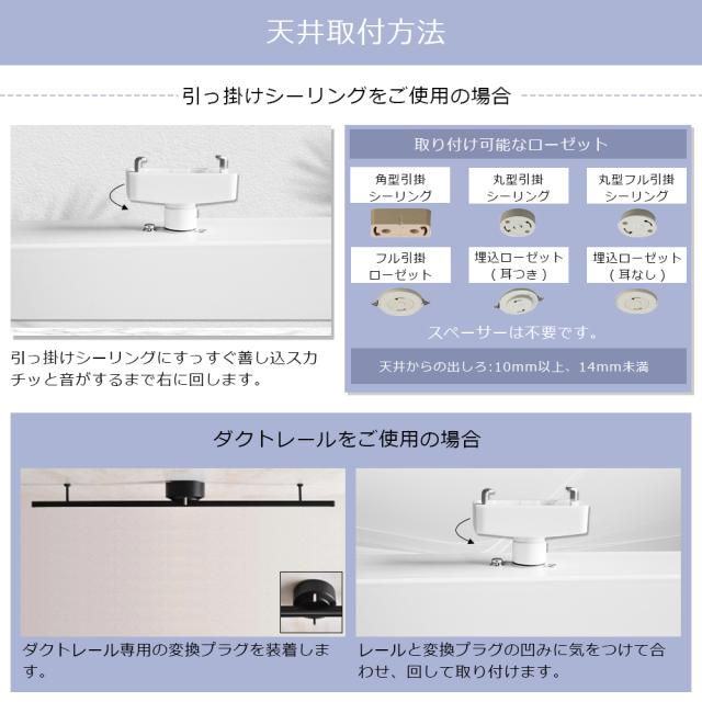 - このシーリングライトは、二つの接続方式に対応しています。引掛けシーリングとダクトレールのそれぞれの方式には異なる特徴があり、照明のニーズや室内環境に応じて最適な方法をお選びいただけます。