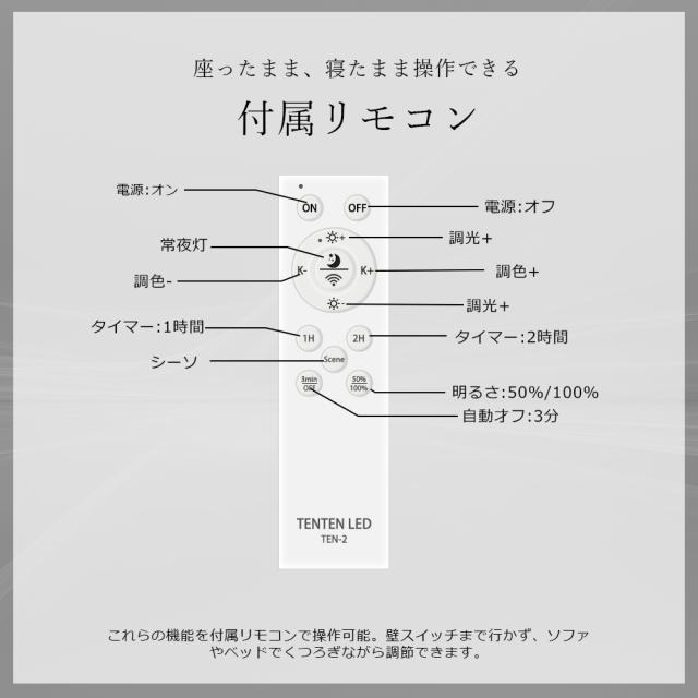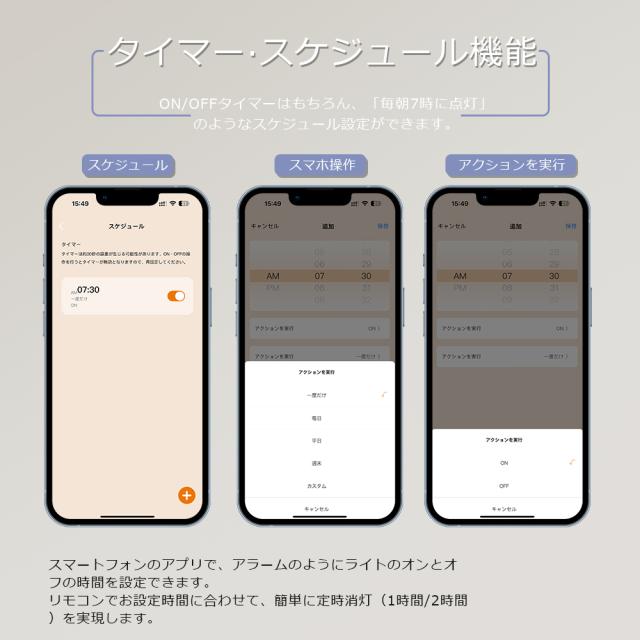 - スケジュール機能を使って、指定した時刻に自動でライトをオン・オフできます。リモコンを使えば、簡単に1時間または2時間のタイマー設定ができます。
