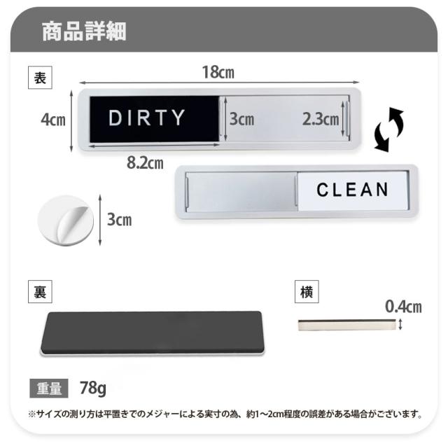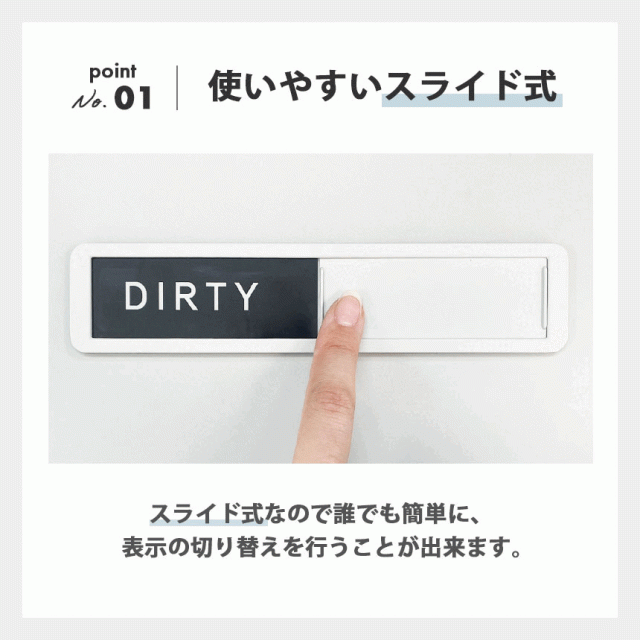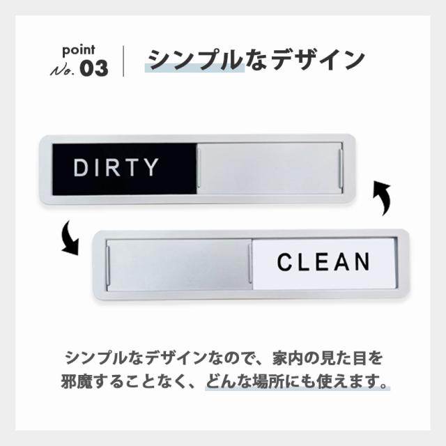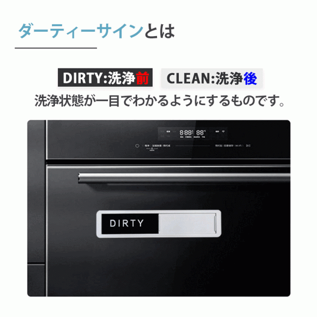 食洗機の食器洗濯機の服「 洗ってある? 」こんなこと家族やルームメイトから聞かれたことありませんか?これで解決できます!ダーティーサインとはDIRTY:洗浄前 CLEAN:洗浄後洗浄状態が一目でわかるようにするものです。point1【使いやすいスライド式】スライド式なので誰でも簡単に、表示の切り替えを行うことが出来ます。