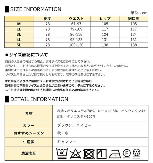 5L:総丈78 ウエスト100-130 ヒップ138 裾口周138