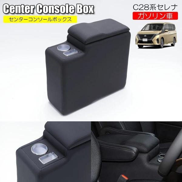 C28系 セレナ ガソリン車用 大型 センターコンソールボックス 特価セール - カップホルダー 小物入れ装備 大型収納 PVCレザー ブラック 肘置き アームレスト