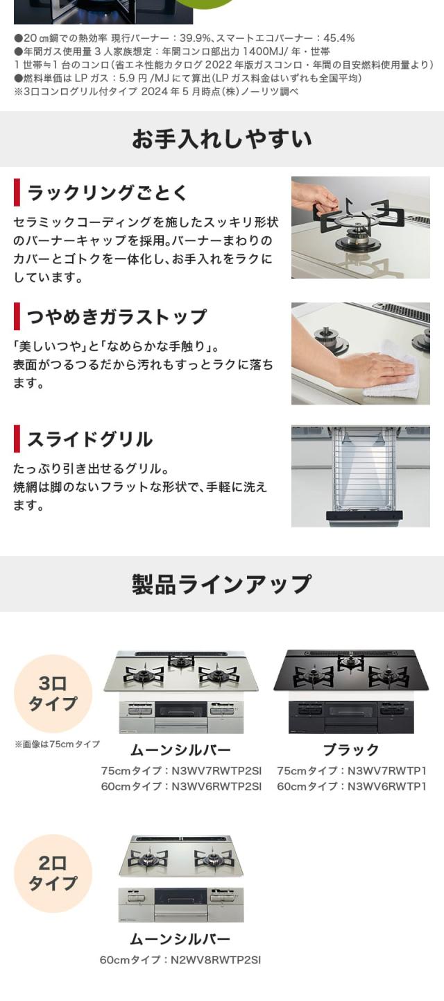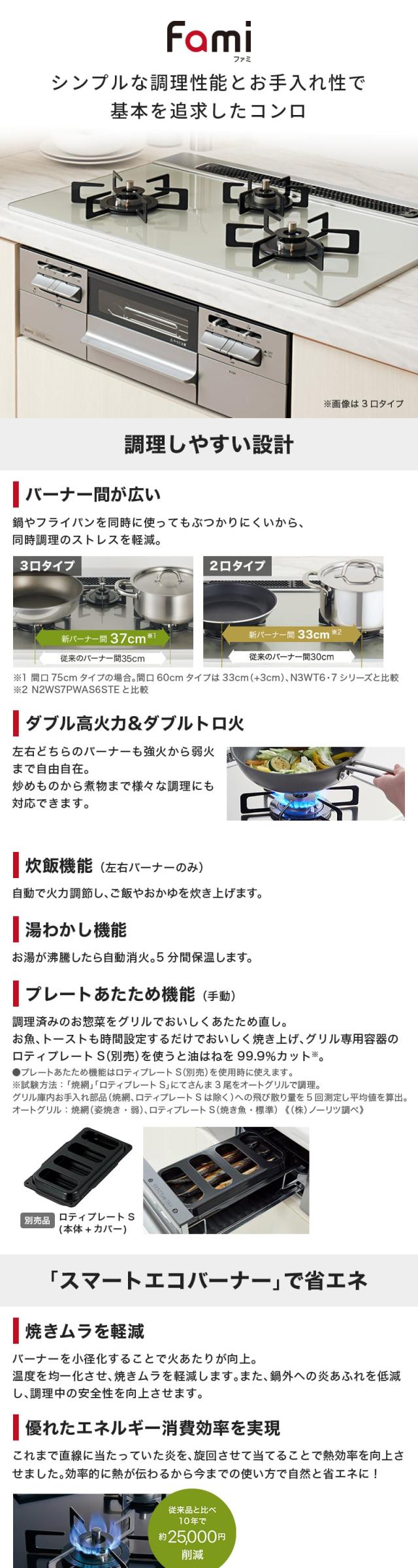 ビルトインガスコンロ 都市ガス用 3口 両側強火タイプ 幅75cm N3WV7RWTP2SI-13A Fami (ファミ)