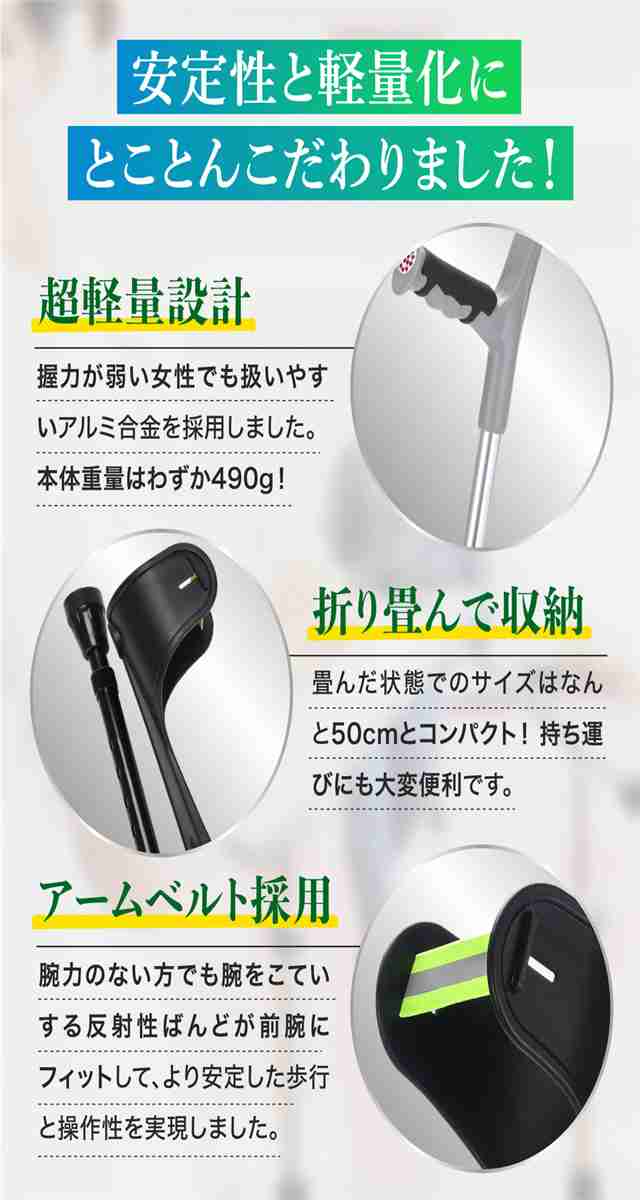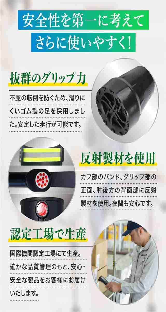 【安定性を強化】 アームベルト採用でグリップから手が離れても杖を落とす心配がなく、ゴム製の足がしっかりと地面を掴むので安心してご使用できます。