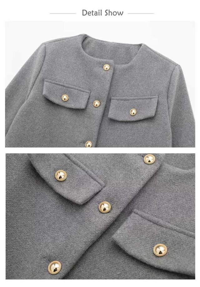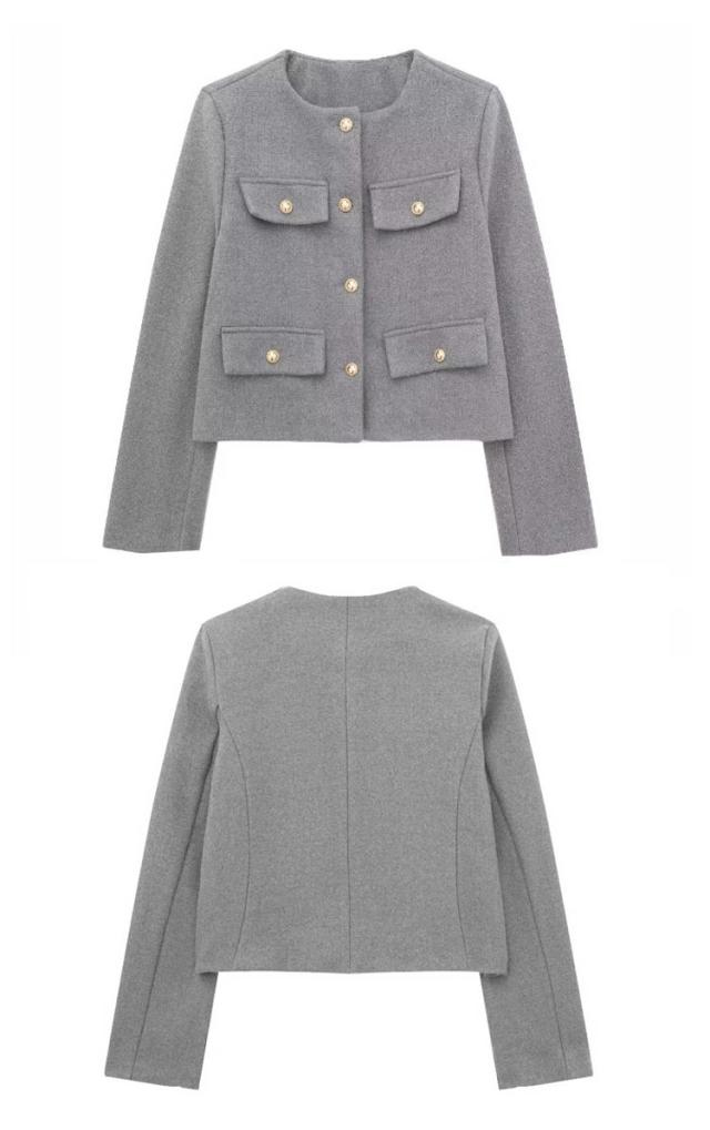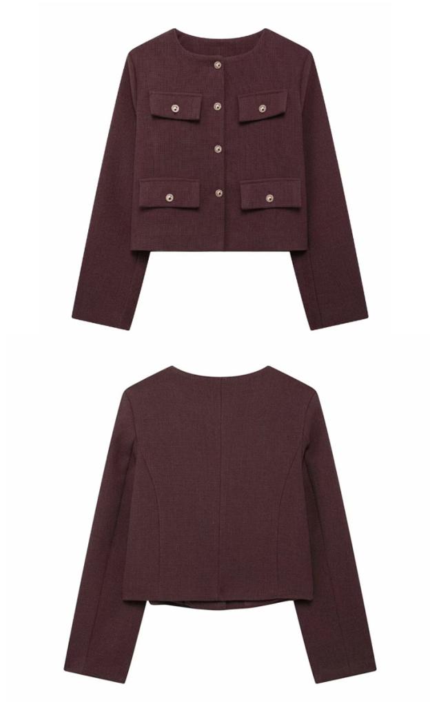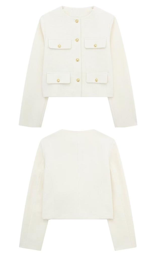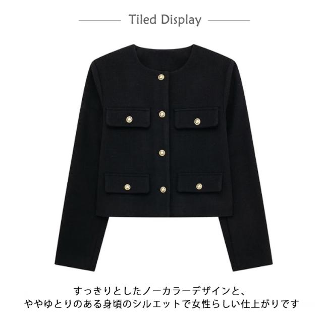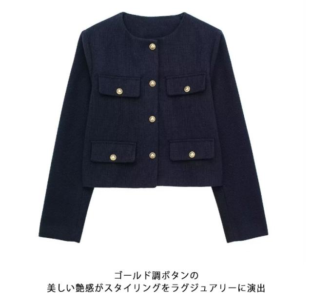 | 立体感のあるポケットデザインのノーカーラージャケット。 すっきりとしたノーカラーデザインと、ややゆとりのある身頃のシルエットで女性らしい仕上がりです。 ゴールド調ボタンの美しい艶感がスタイリングをラグジュアリーに演出。 デートやオフィススタイル、カジュアルコーデのクラスアップにと、オンにもオフにも幅広く活躍してくれるアイテム。 | |