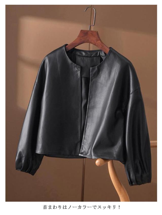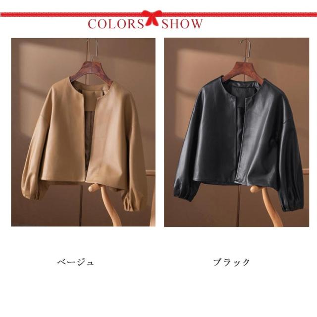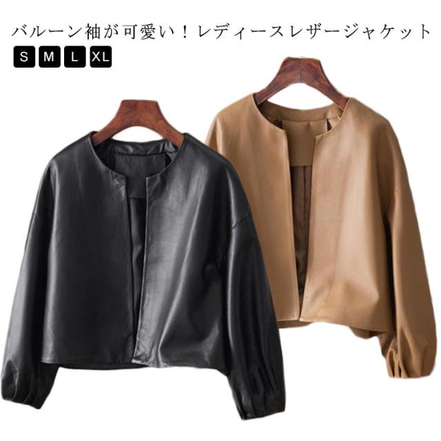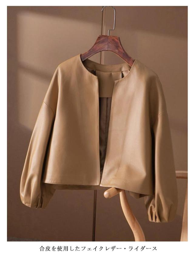 レディース ノーカラージャケット ノーカラー レザージャケット ノーカラー 革ジャケット フェイクレザージャケット バルーン袖 春秋 合皮 アウター ジャケット ショート 大人女性 ジャケット ライダース ジャケット 通勤 OL 無地 シンプル 大人可愛い ギフト