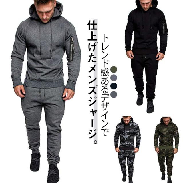 スポーツウエア ジャージ メンズ 上下セット メンズ セットアップ 無地 迷彩柄 プルオーバーパーカー スウエット ジョガーパンツ 春服