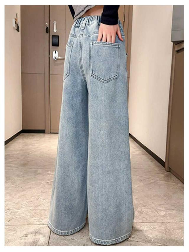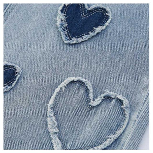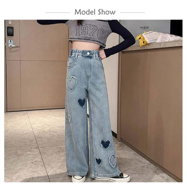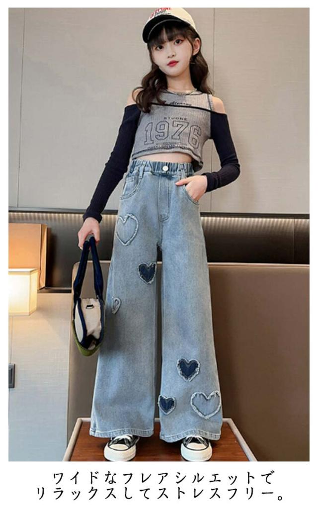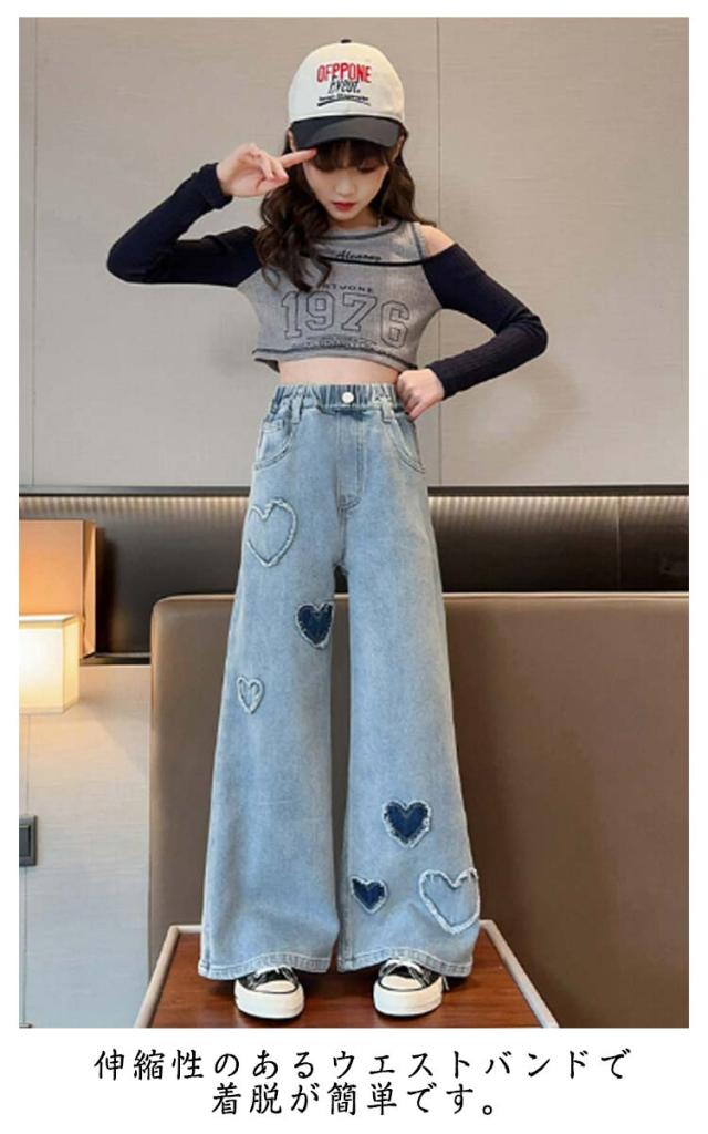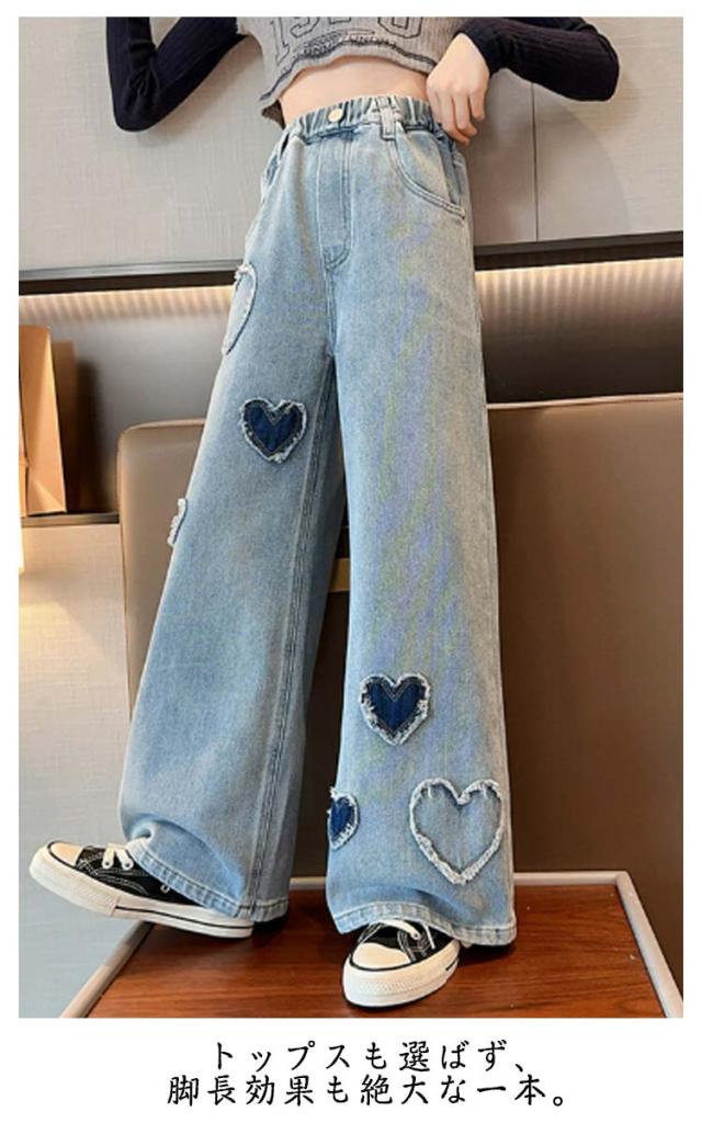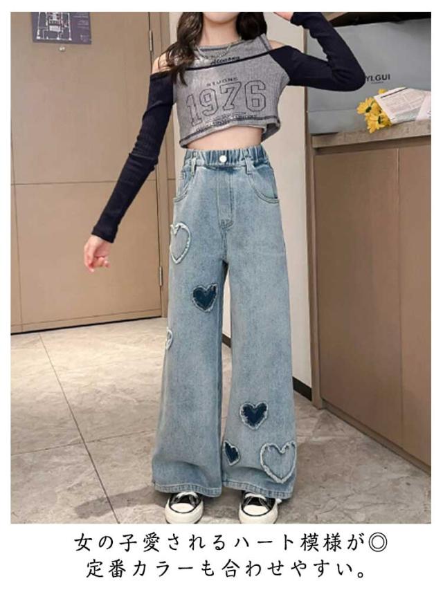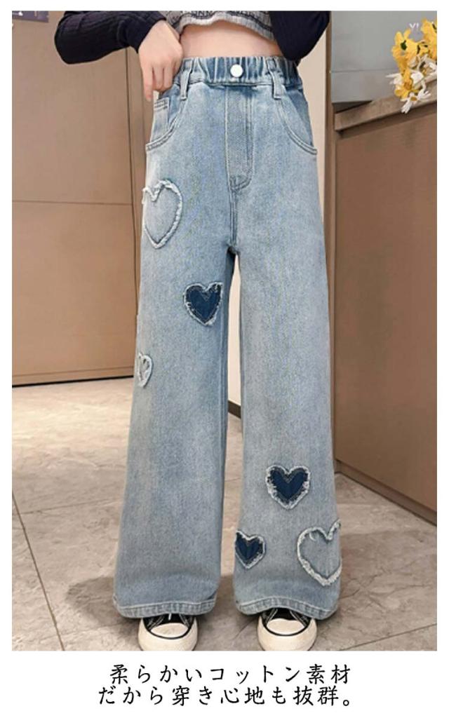 ジーンズ ウエストゴム キッズ ワイドパンツ 衣装 デニム 120 160 女の子 デニムパンツ 子供 可愛い 130 140 150 Jeans 170 ロングパンツ ハート ジュニア キッズ 小学生 中学生 秋服