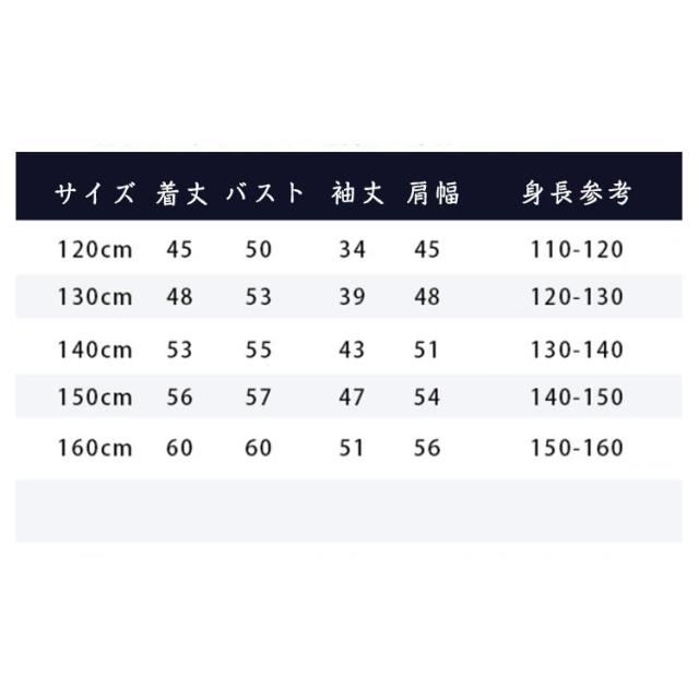 | サイズについての説明 | 120 着丈(45cm) バスト(50cm) 袖丈(34cm) 肩幅(45cm) 身長参考(110-120cm) 130 着丈(48cm) バスト(53cm) 袖丈(39cm) 肩幅(48cm) 身長参考(120-130cm) 140 着丈(53cm) バスト(55cm) 袖丈(43cm) 肩幅(51cm) 身長参考(130-140cm) 150 着丈(56cm) バスト(57cm) 袖丈(47cm) 肩幅(54cm) 身長参考(140-150cm) 160 着丈(60cm) バスト(60cm) 袖丈(51cm) 肩幅(56cm) 身長参考(150-160cm) ※測定方法によって誤差が生じますので、予めご了承下さい。 |