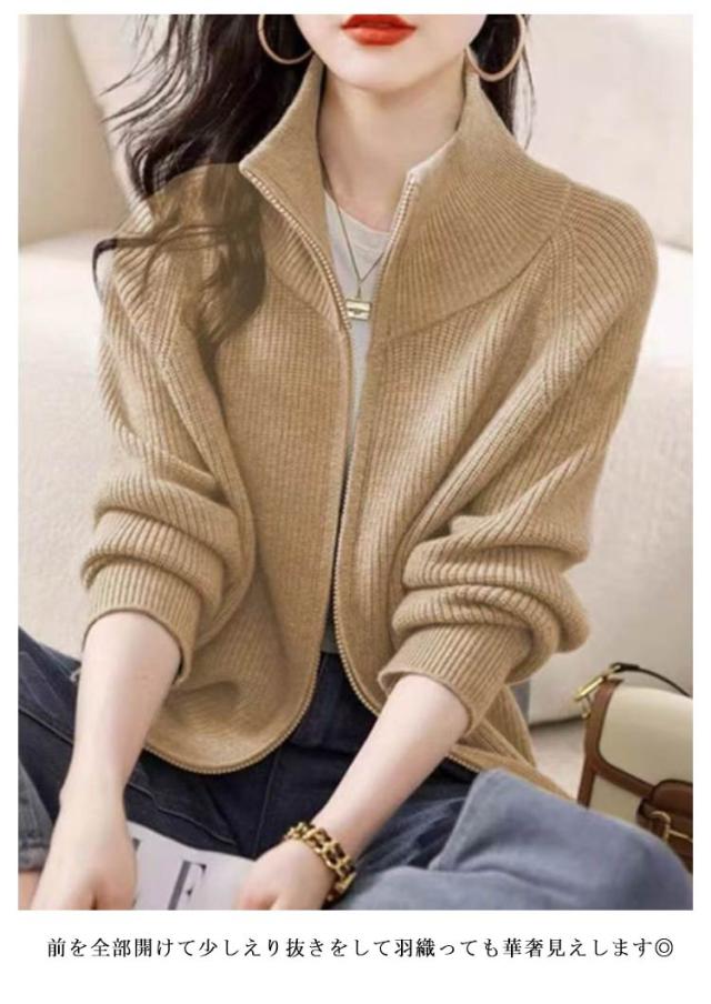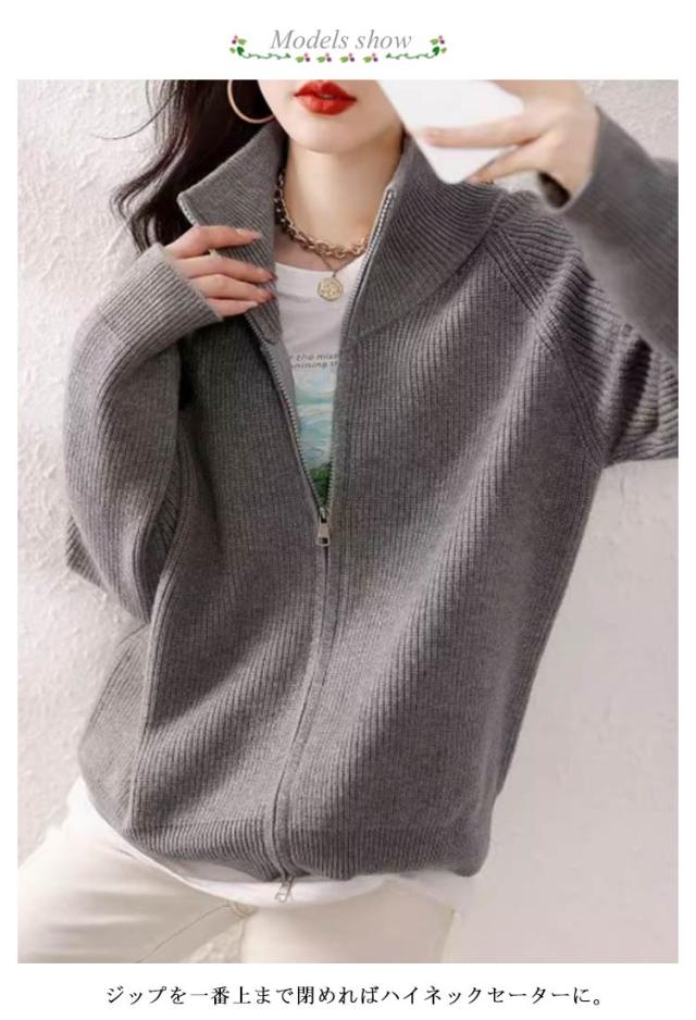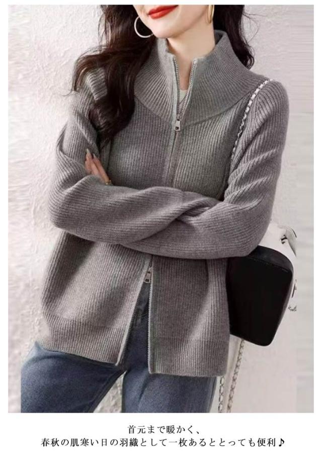 | 肌寒い日のライトアウターに。ダブルジップニットカーディガン。 ジップを一番上まで閉めればハイネックセーターに。 首元まで暖かく、春秋の肌寒い日の羽織として一枚あるととっても便利♪ 上のジップを少し下げて襟を倒せばきちんと感UP! 前を全部開けて少しえり抜きをして羽織っても華奢見えします◎ ニットジャケットには珍しいダブルジップ仕様で閉め方ひとつで印象がグッと変わります。 合わせるボトムスを選ばず、オン/オフさまざまなシーンで活躍します。 | |