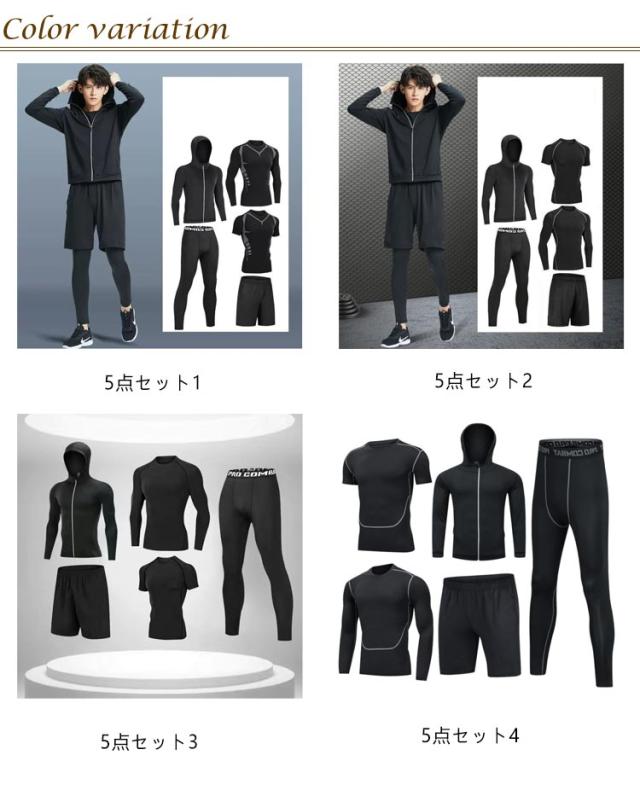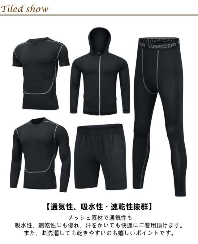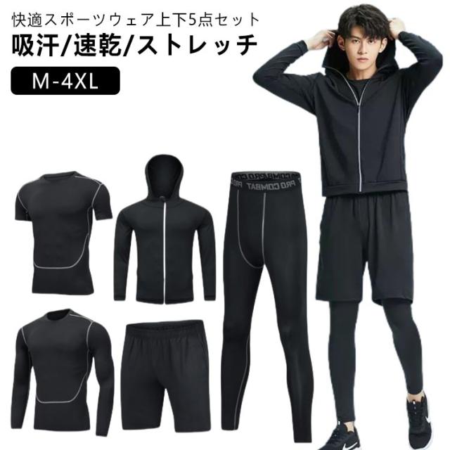 | 快適スポーツウェア上下5点セット 吸汗/速乾/ストレッチ 反射材入り M-4XL 半袖シャツ・長袖シャツ・パーカー・ショートパンツ・レギンスの5点セットのスポーツウェア。 組み合わせ自在で、1年を通して便利にお使い頂けます。 モノトーンを基調にしたおしゃれでスタイリッシュなデザインも魅力。 豊富なバリエーションで、お好みのデザインをお選び頂けます。 【伸縮性に優れたコンプレッションウェア】 伸縮性の高いストレッチ素材を採用。 身体に圧をかけることで、さまざまなサポート効果をもたらす機能性ウェアです。 どんな動きにも自然にフィットし、使用感抜群です。 【反射機能付きで安全!】 特殊な反射ロゴにより、夜道や大雨の時は後ろの車から発見しやすく安心安全です。 【通気性、吸水性・速乾性抜群】 メッシュ素材で通気性も◎ 吸水性、速乾性にも優れ、汗をかいても快適にご着用頂けます。 また、お洗濯しても乾きやすいのも嬉しいポイントです。 【多彩なスポーツシーンで大活躍】 ジムでのエクササイズ、ジョギング、野球、ゴルフなど多彩なスポーツシーンにおすすめ。 機能性とデザイン性を兼ね備えたうれしいアイテムなので、大切な方へのプレゼントにも最適です。 | |