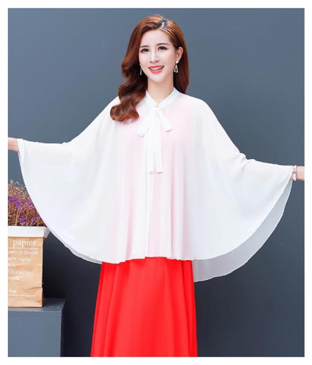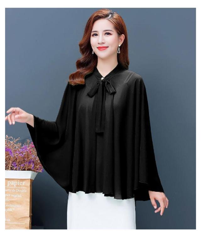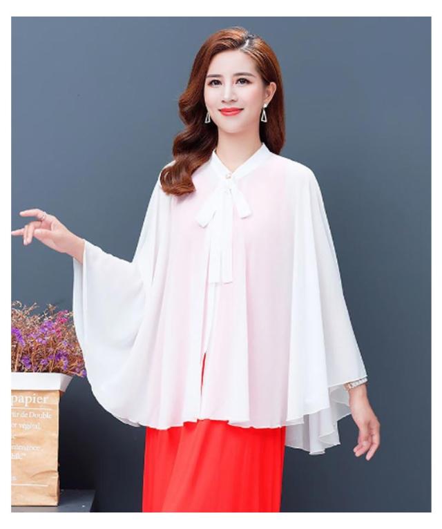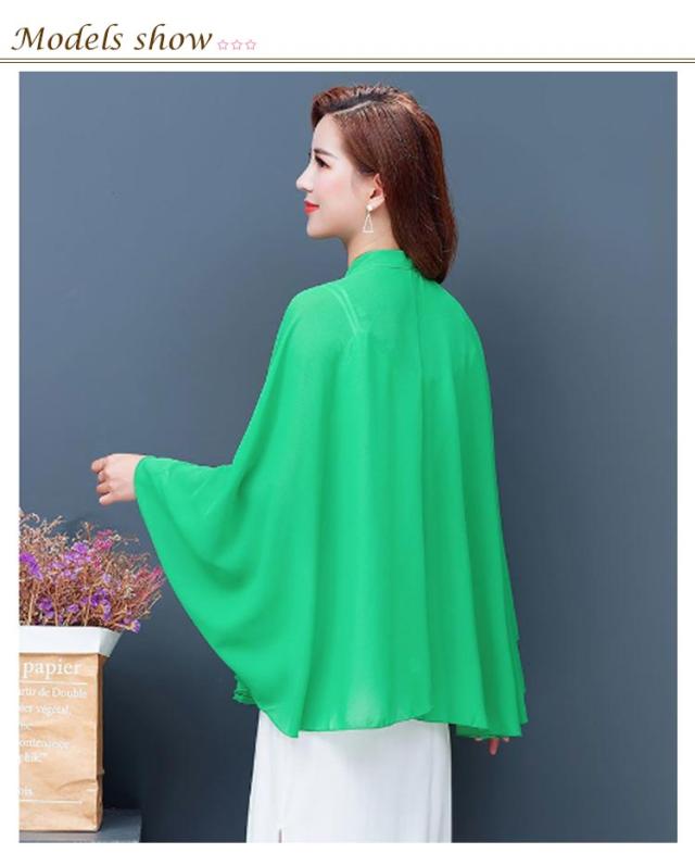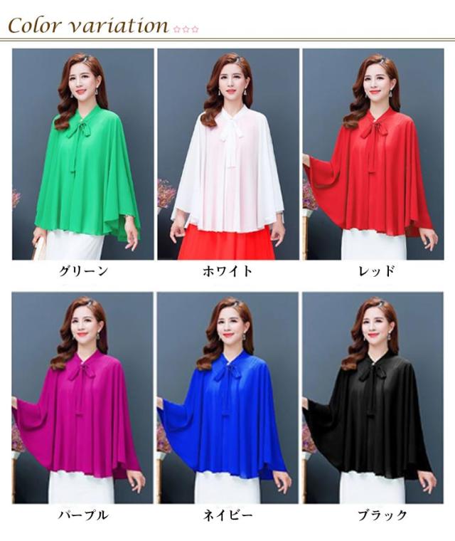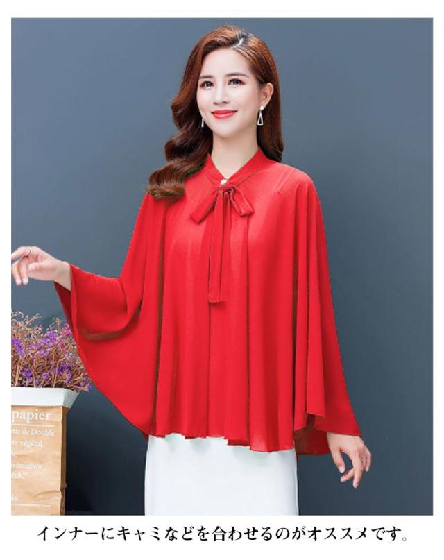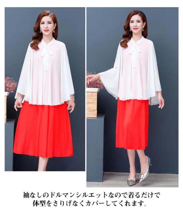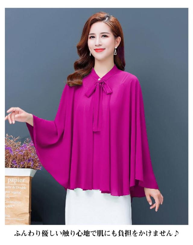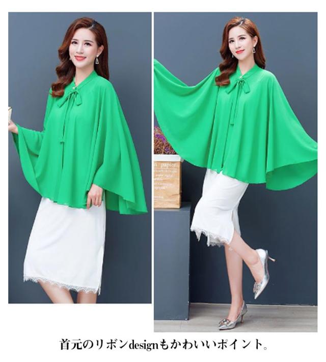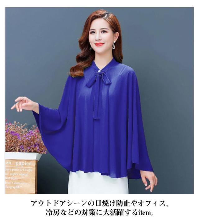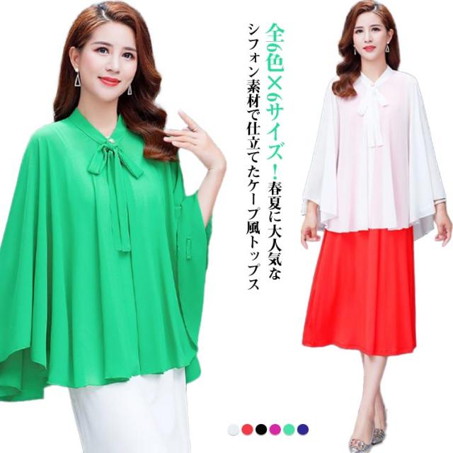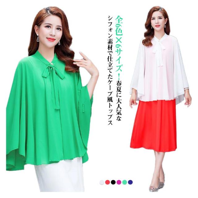 | 全6色×6サイズ!春夏に大人気なシフォン素材で仕立てたケープ風トップス 首元のリボンdesignもかわいいポイント。 袖なしのドルマンシルエットなので着るだけで体型をさりげなくカバーしてくれます。 インナーにキャミなどを合わせるのがオススメです。 ふんわり優しい触り心地で肌にも負担をかけません♪ アウトドアシーンの日焼け防止やオフィス、冷房などの対策に大活躍するitem。 | |