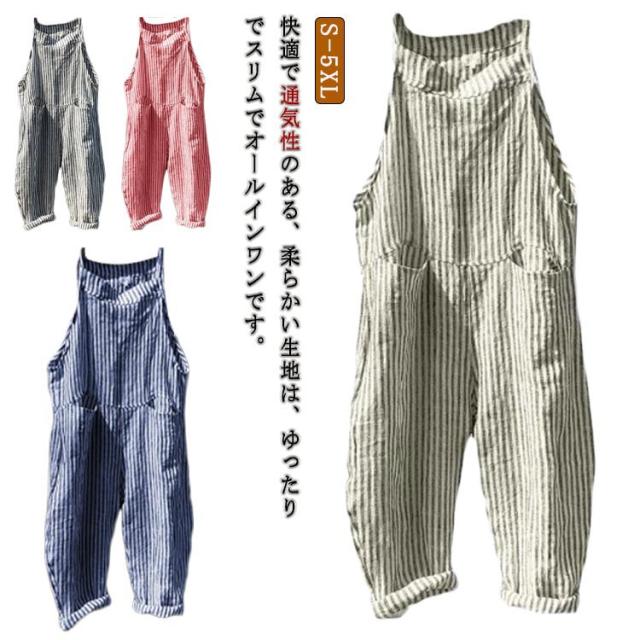 かわいい 体型カバー サロペット シンプル オーバーオール ワイドパンツ 夏 オールインワン ノースリーブ サロペット ストライプ 春 美脚 対応 ロング丈 レディース 秋 通勤 通学 ゆったり 可愛い 大きいサイズ カジュアル 通勤 通学 おしゃれ シンプル