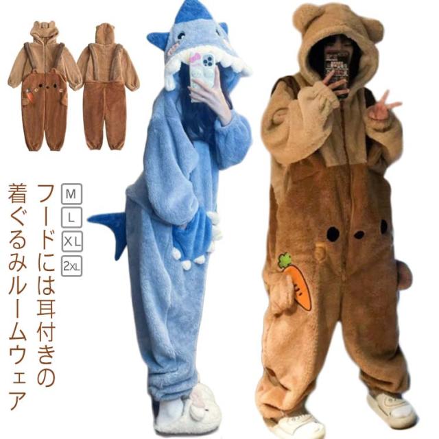 着る毛布 ルームウェア 着ぐるみ つなぎ パジャマ オールインワン レディース フリース 長袖 フード付き ロンパース オーバーオール ナイトウェア 防寒 あったか 部屋着 寒さ対策 ふわふわ もこもこ 動物 アニマル ゆったり 冬