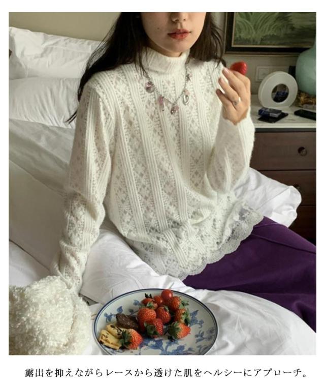 ハイネック カットソー 長袖 裾レース 付け裾 Tシャツ レース レディース 裾 トップス ゆったり レイヤード 重ね着風 インナー 透け レーストップス シースルー シアートップス プルオーバー 裾レース シアー きれいめ 春 秋 冬
