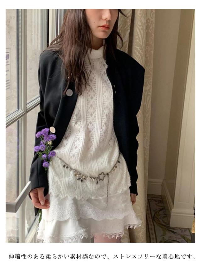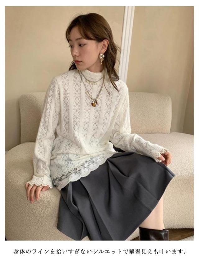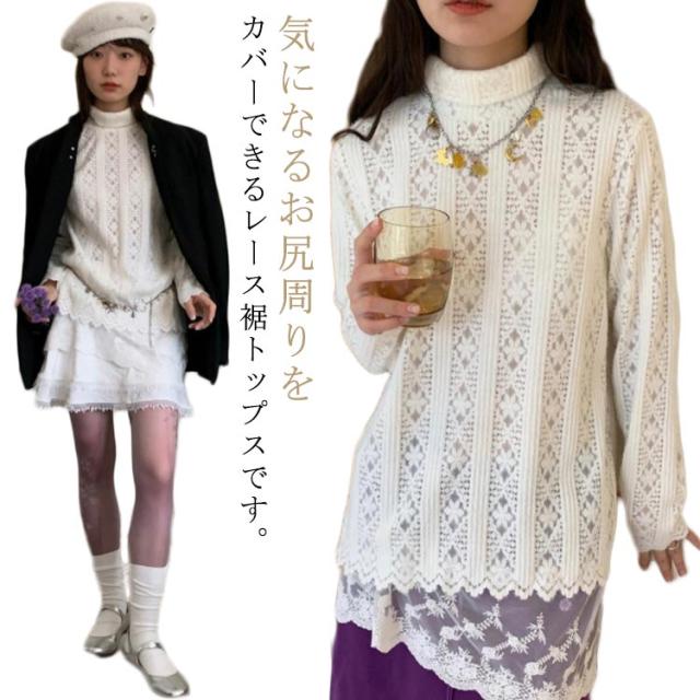 レーストップス 長袖 レースインナー レディース トップス シアートップス カットソー 裾 Tシャツ 付け裾 裾レース レイヤード 重ね着風 インナー レース シアー シースルー ハイネック プルオーバー ゆったり 透け きれいめ 春 秋 冬