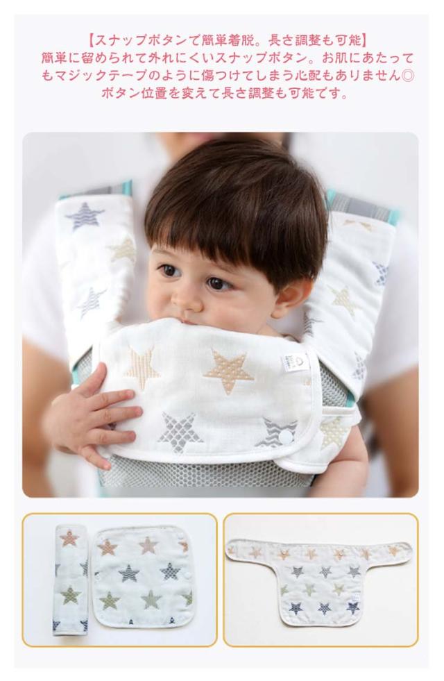 | 抱っこ紐の汚れ防止に! よだれカバー 6重ガーゼ綿 全20柄 【3点セット】 【抱っこ紐の汚れ防止に】 吸水性、速乾性に優れたよだれカバー。 簡単装着で、よだれや寝汗で汚れやすい抱っこ紐を守ります。パパ・ママのお洋服の汚れ防止にも! 【赤ちゃんのお肌に優しい綿】 赤ちゃんのお肌やお口に触れるものだから、天然素材100%が安心。 優しい肌触りでお肌が敏感な赤ちゃんにも安心です。 【2wayタイプの胸当てカバー】 対面抱っこ、前向き抱っこの両方に対応可能な胸当てカバー。 付け替えが簡単なのも嬉しいポイントです。 【スナップボタンで簡単着脱。長さ調整も可能】 簡単に留められて外れにくいスナップボタン。お肌にあたってもマジックテープのように傷つけてしまう心配もありません◎ボタン位置を変えて長さ調整も可能です。 【多くの抱っこ紐に対応】 ベルト幅が8cm以上あれば使用可能な汎用タイプ。 実際に多くのブランドの抱っこ紐で使用されているので安心です。 | |