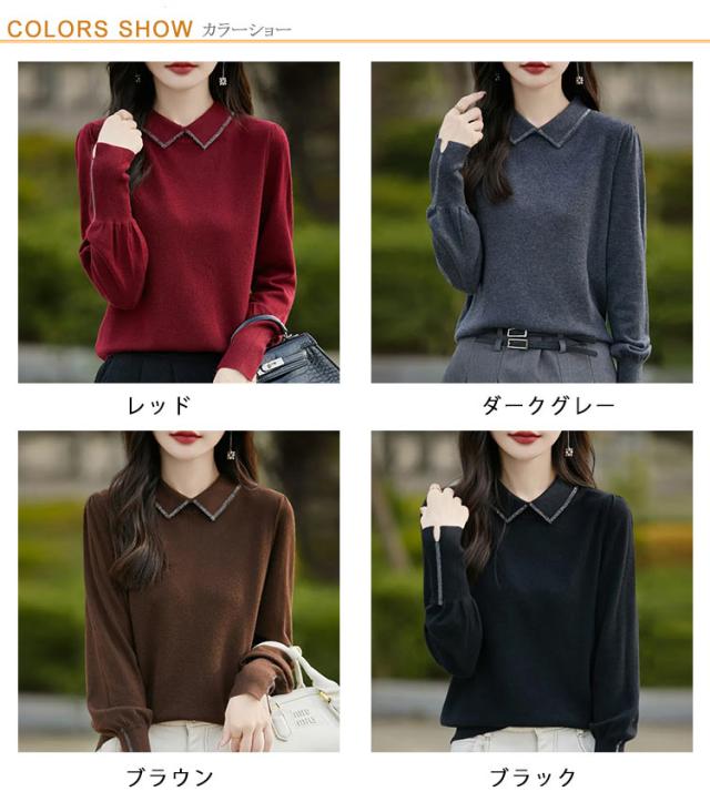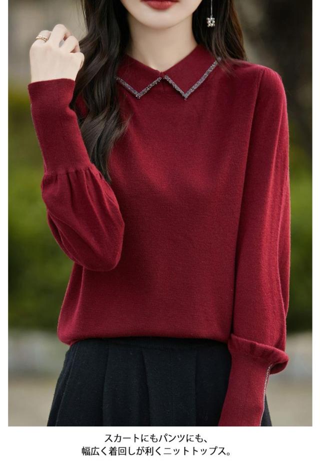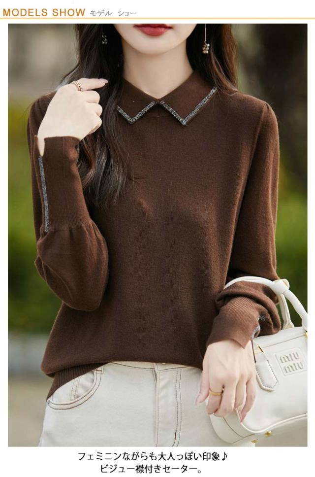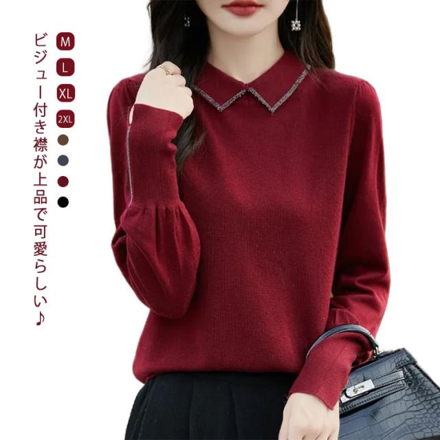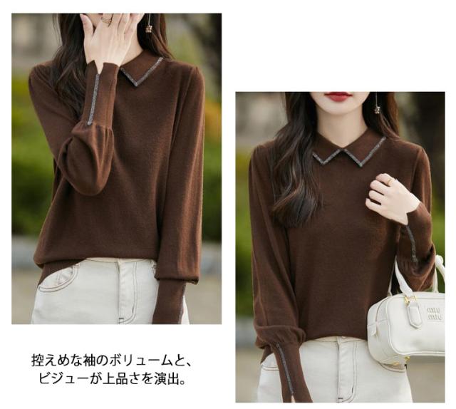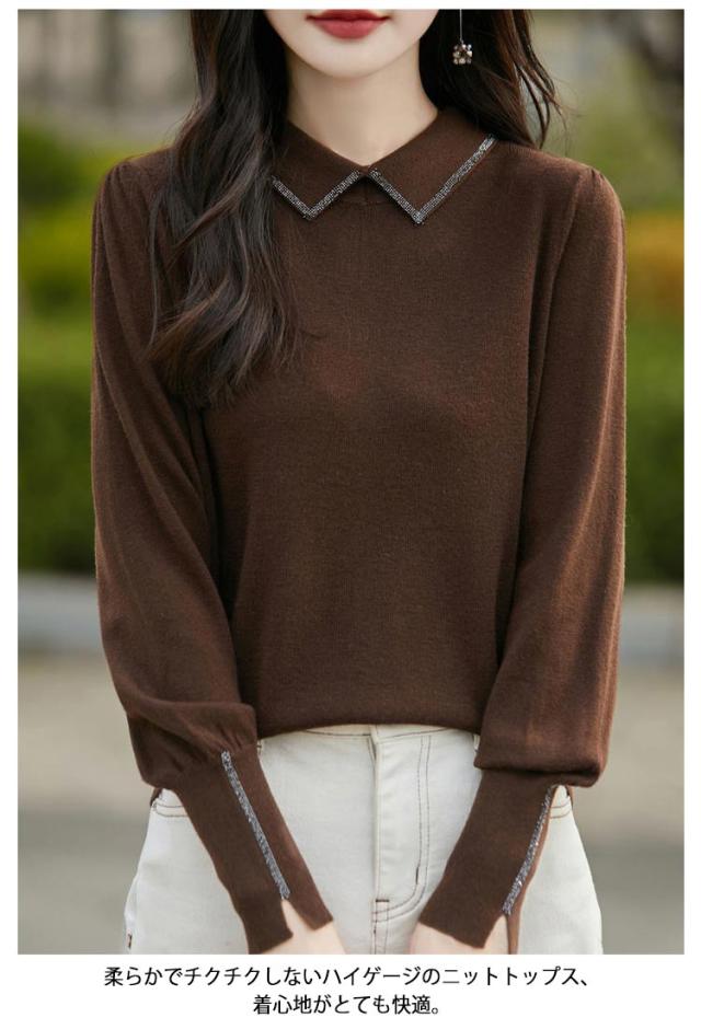 レディース セーター 襟ニットトップス セーター ビジュー付き ポロ襟 ニットセーター パフスリーブ フェミニン 韓国ファッション 襟ニットトップス 秋冬服 ハイゲージ ニットセーター おしゃれ ニットプルオーバー 大人可愛い 華やか