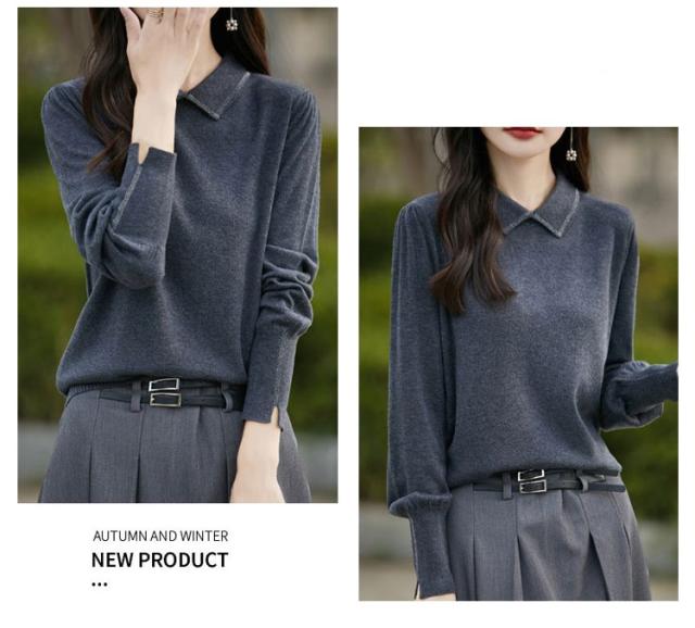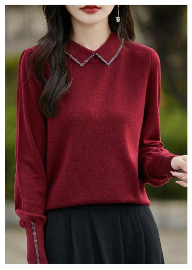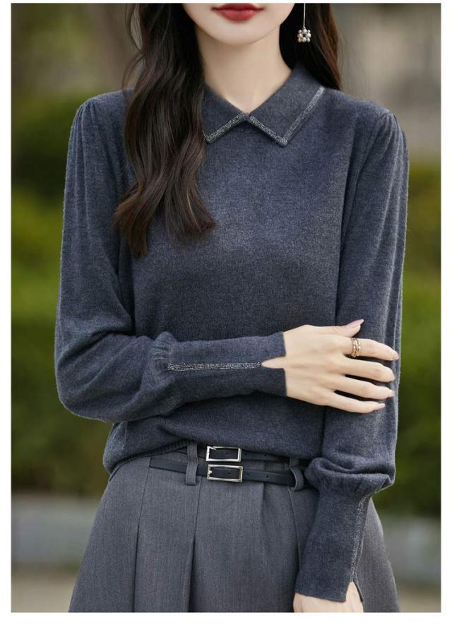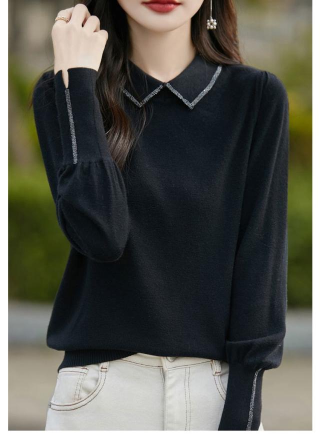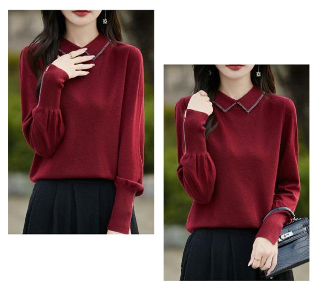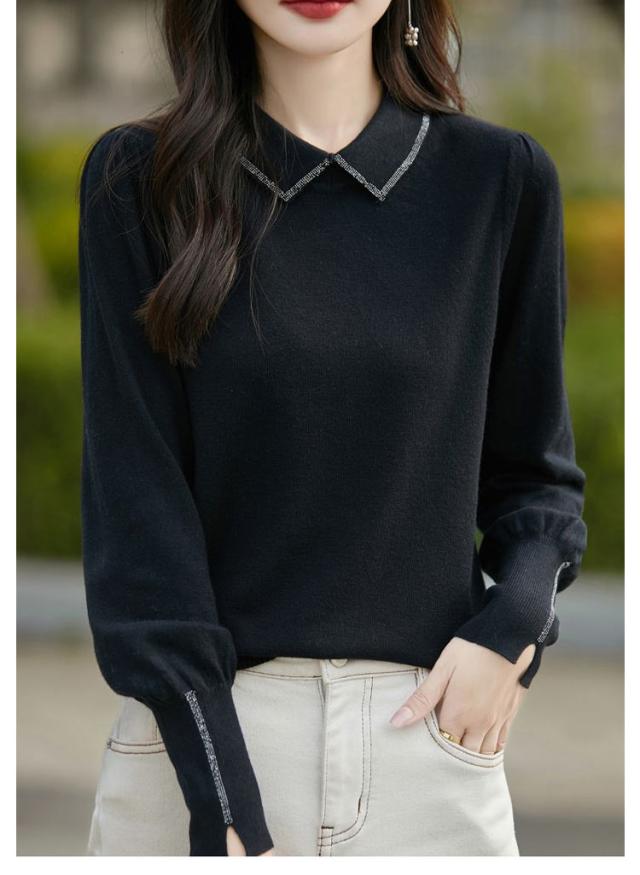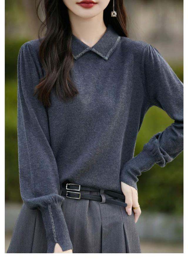 レディース セーター 襟ニットトップス セーター ビジュー付き ポロ襟 ニットセーター パフスリーブ フェミニン 韓国ファッション 襟ニットトップス 秋冬服 ハイゲージ ニットセーター おしゃれ ニットプルオーバー 大人可愛い 華やか
