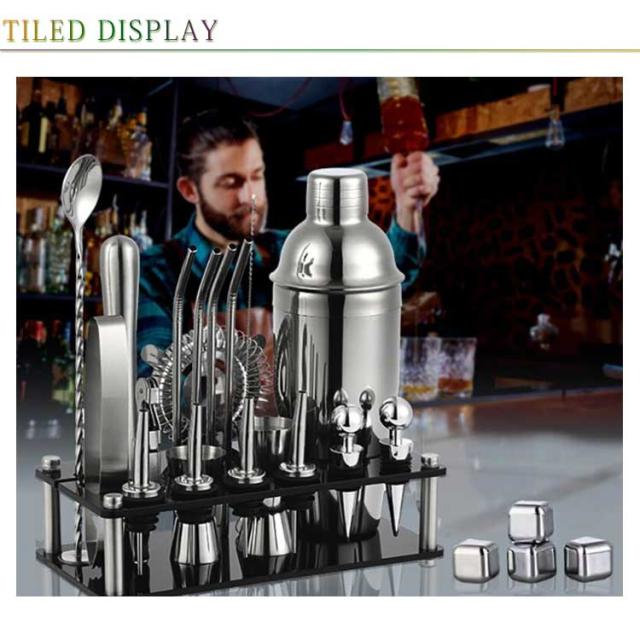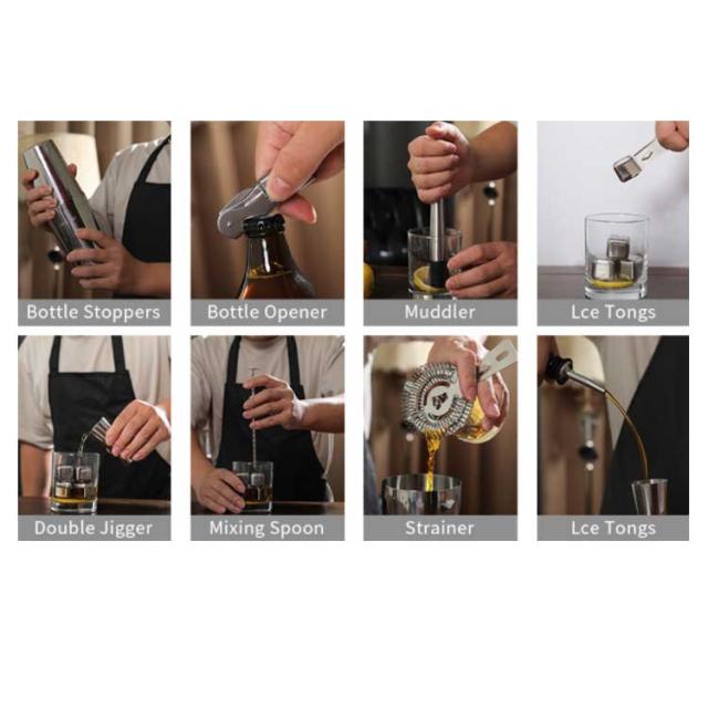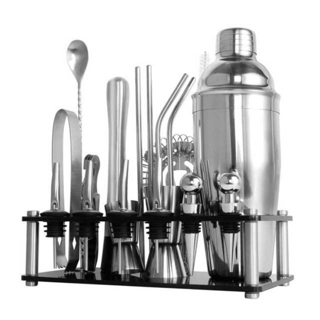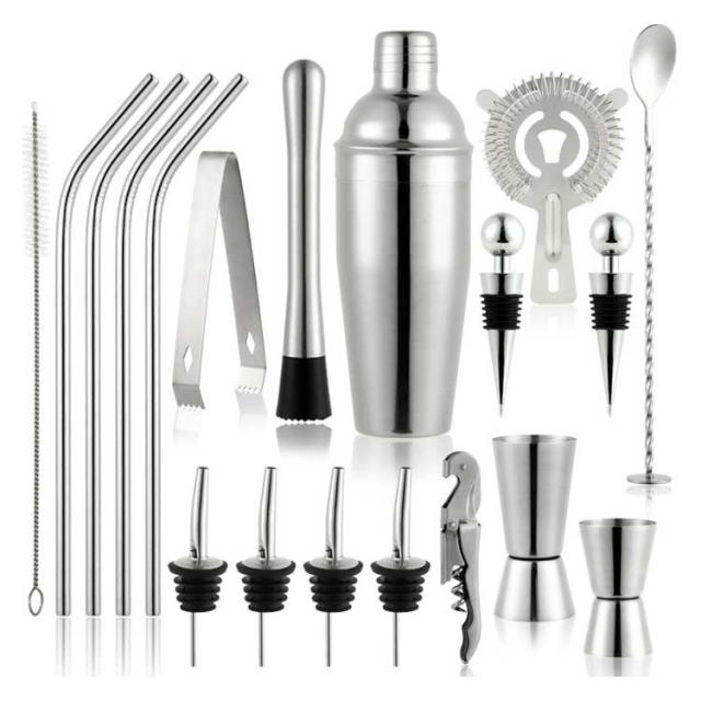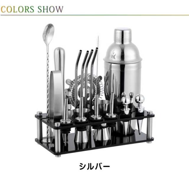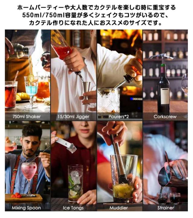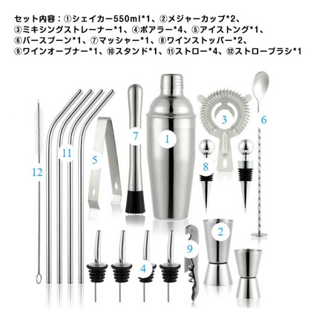 | 【カクテルシェーカー 20点セット】【ステンレス製】【550ml/750ml】 ホームパーティーや大人数でカクテルを楽しむ時に重宝する550ml/750ml容量が多くシェイクもコツがいるので、カクテル作りになれた人におススメのサイズです。 お家でカクテルを味わうために必要な20点をセットにしました。初心者の方でもわかりやすいように必要最低限のセットにしております。 オールステンレス製で高級感があり、お部屋のインテリアとしても、とても映えます。友人を招いたり恋人を招いたりホームパーティーの際には、カクテルを作って楽しむことはもちろん、お洒落なインテリアとしても活躍します。 セット内容:1.シェイカー550ml*1、2.メジャーカップ*2、3.ミキシングストレーナー*1、4.ポアラー*4、5.アイストング*1、6.バースプーン*1、7.マッシャー*1、8.ワインストッパー*2、9.ワインオープナー*1、10.スタンド*1、11.ストロー*4、12.ストローブラシ*1 | |