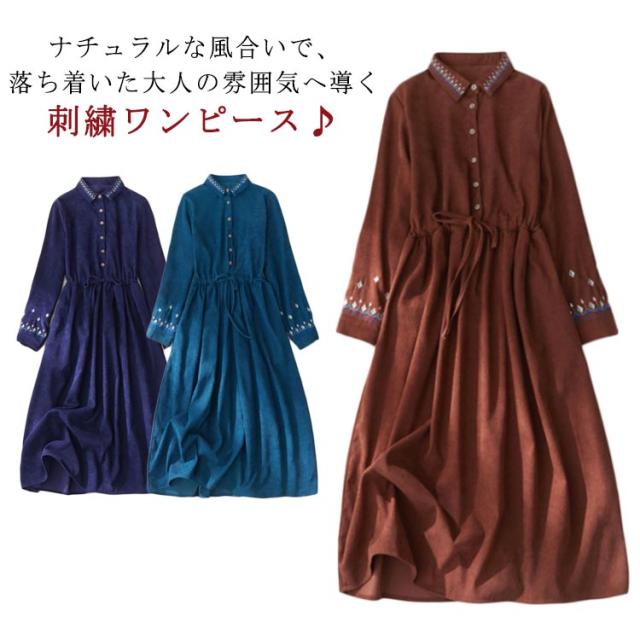 コーデュロイ ワンピ 50代 刺繍 ロング丈 花柄刺繍 無地 ウエストリボン シャツワンピース ボタン 着痩せ 40代 花柄刺繍 長そで ロングシャツ シャツワンピース 羽織り 20代 30代 ゆったり ボリューム袖 送料無料 春 秋 ブルー グリーン