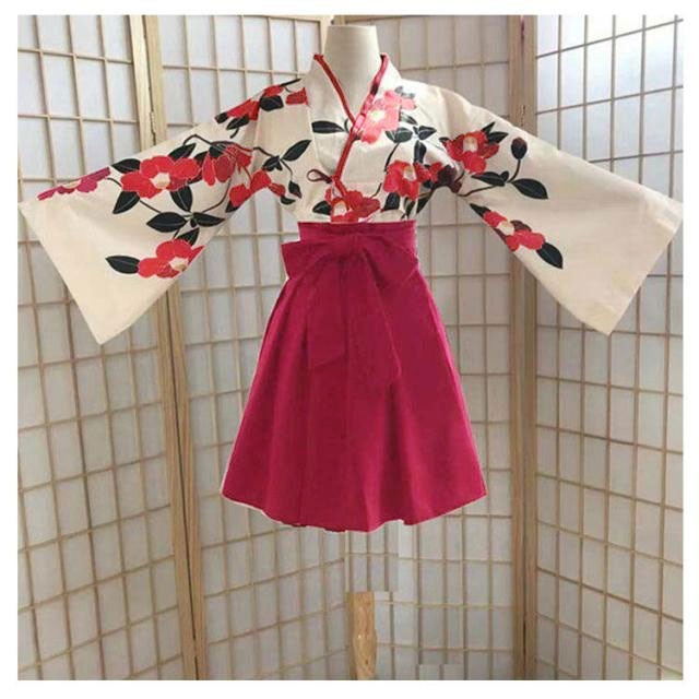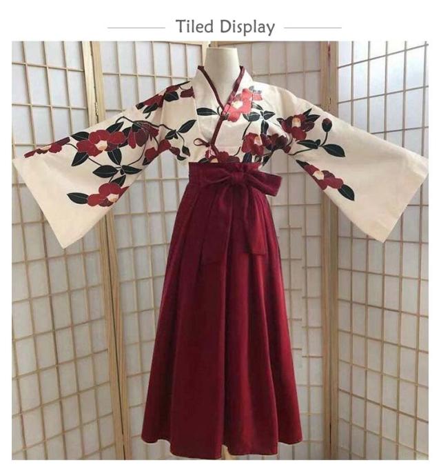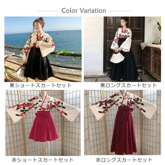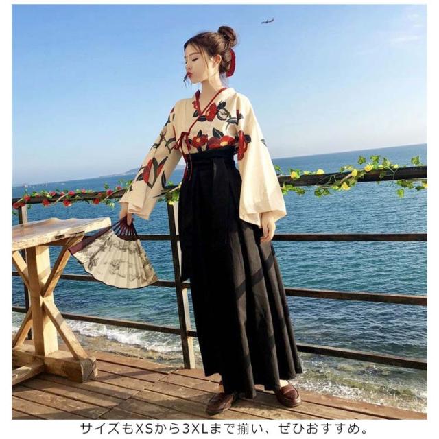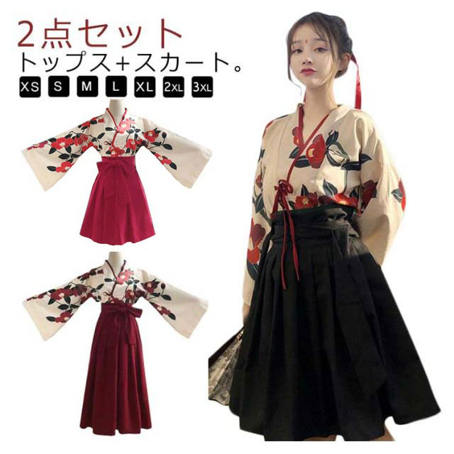 | トップス+スカート。着物トップス&袴風スカートのセットアップ着物コスチューム。 大柄に入ったツバキの模様が白地に映え、今風のデザインになってます。 着物よりも気軽に着れる和服としておすすめです。 サイズもXSから3XLまで揃い、ぜひおすすめ。 | |