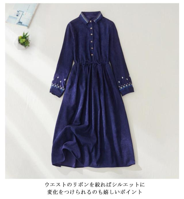 無地 刺繍 ワンピ シャツワンピース ロング丈 着痩せ 花柄刺繍 50代 ワンピース 花柄刺繍 コーデュロイ 40代 ウエストリボン 長そで ボリューム袖 シャツワンピース 羽織り 20代 30代 ゆったり ボタン 送料無料 春 秋 ブルー グリーン