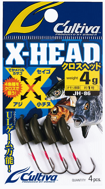 OWNER Cultiva ソルト ジグヘッド ルアー ワーム フック ハリ 釣り針 鈎 カサゴからセイゴまで。ULゲーム万能。 「クロスヘッド」という名のジグヘッドです。ヘッドウエイトは軽めですが、少し太軸のハリが特徴です。 ですから、チヌにも使えます。また、尺メバルの抜き上げも可能です。海のULゲーム全魚種の「交差点」に位置する絶妙さ。ですから「クロスヘッド」なのです。 |