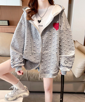 ゆったり 前開き フード付きトレーナー エンボス加工 ゆるアウター 長袖トップス フーディー体型カバーライトアウター羽織り カジュアル ハート刺しゅうロゴ ストリート 着やせ