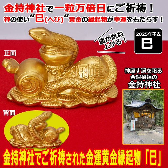 運気大飛躍の年に、神の使いでもある”へび”の黄金置物を、神座す渓を祀る【金運神社】(かもちじんじゃ)にて、一粒万倍日にご祈祷頂いた縁起物です。