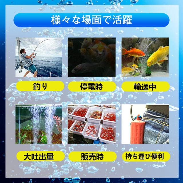屋外釣り、生き餌、池、魚介類への酸素供給、金魚や観賞魚の水槽内の酸素供給、活魚の輸送などに様々なシーンで大活躍