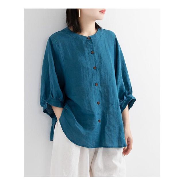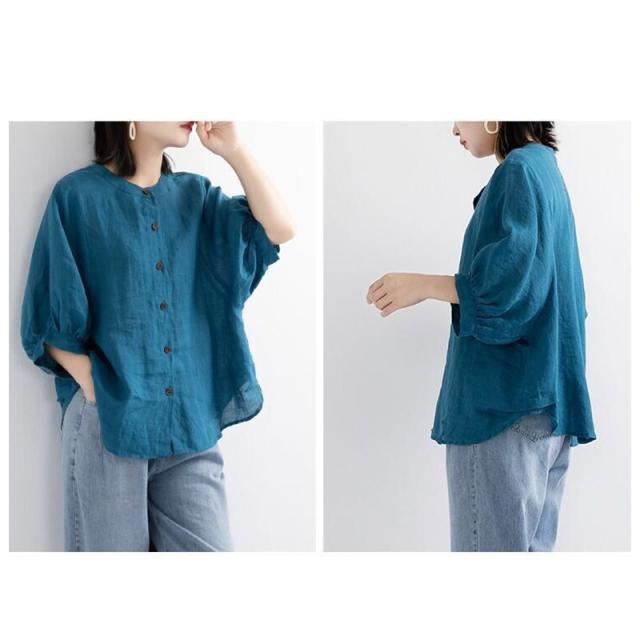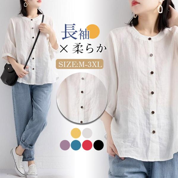 レディース 丸襟 半袖 リネンシャツ ブラウス 夏 トップス カジュアル 無地 ナチュラル 春 羽織り シャツ 大きいサイズ 体型カバー