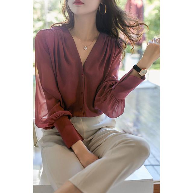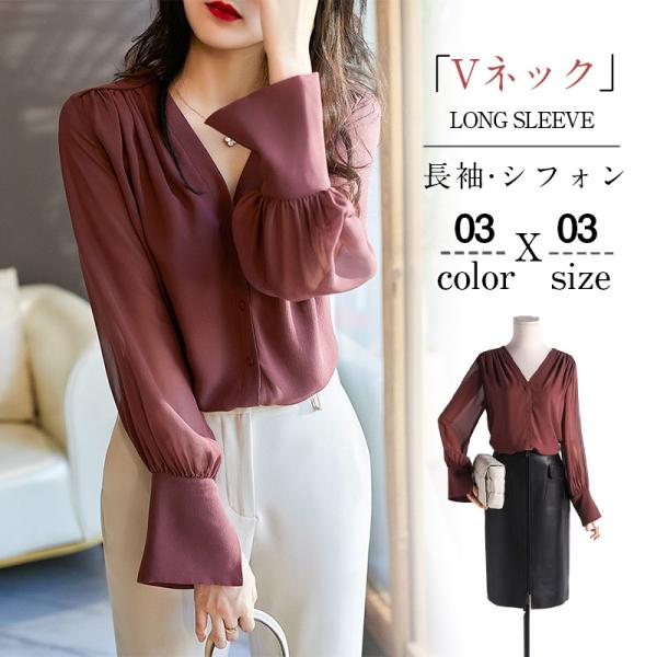 ブラウス レディース シャツ トップス Vネック バルーンスリーブ バルーン袖 シフォンVネックシフォンスリーブブラウス