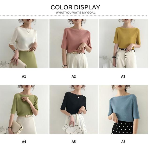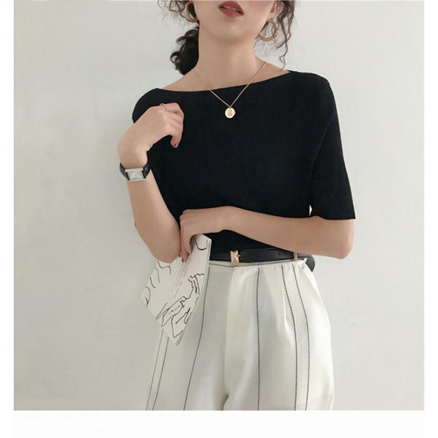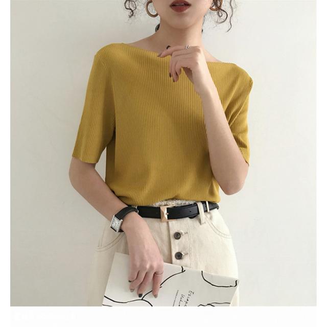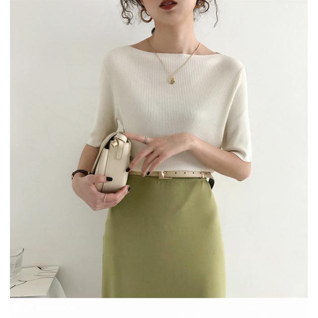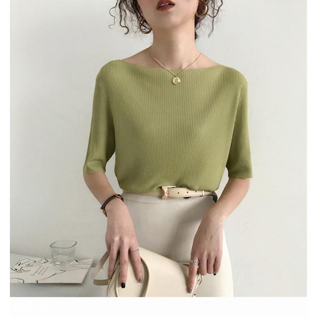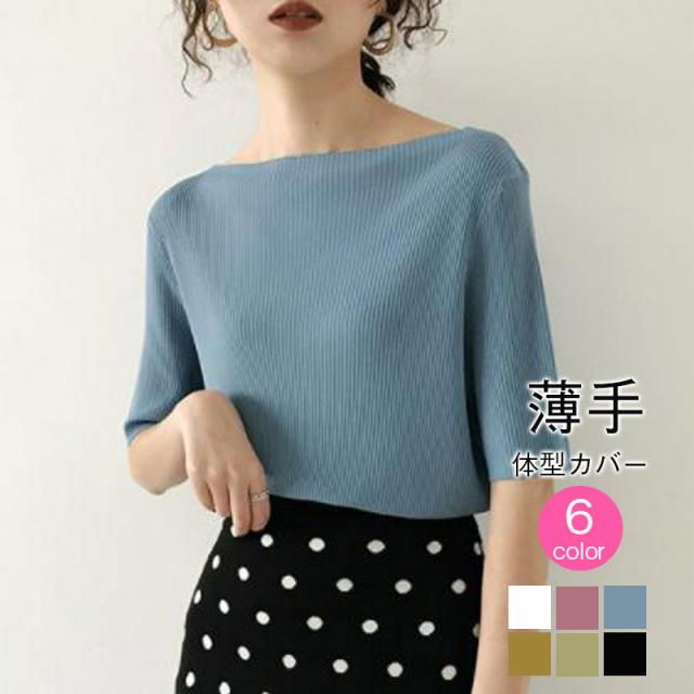 リブ ニット 半袖 トップス 五分袖 無地 薄手 ラウンドネック 春 夏 6色展開 フリーサイズ コーデ 春 夏 秋 エレガント 大人気
