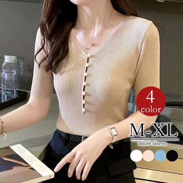 Tシャツ シャツ ニットシャツ ニット レディース 半袖 リブニット 薄手 シンプル 無地 トップス 接触冷感 Vネック 涼しい 夏用 肌着 一部即納