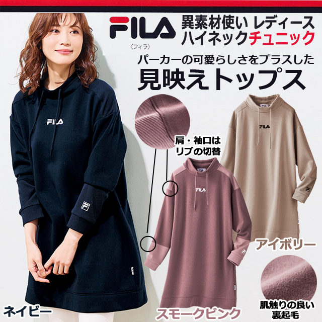 女性用 フィラ 裏起毛 トップス(FILAレディース異素材使いハイネックチュニック)秋冬 婦人服 ミセス シニア あったか 暖かい ヒップカバー