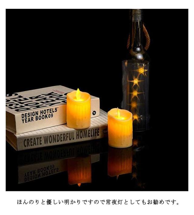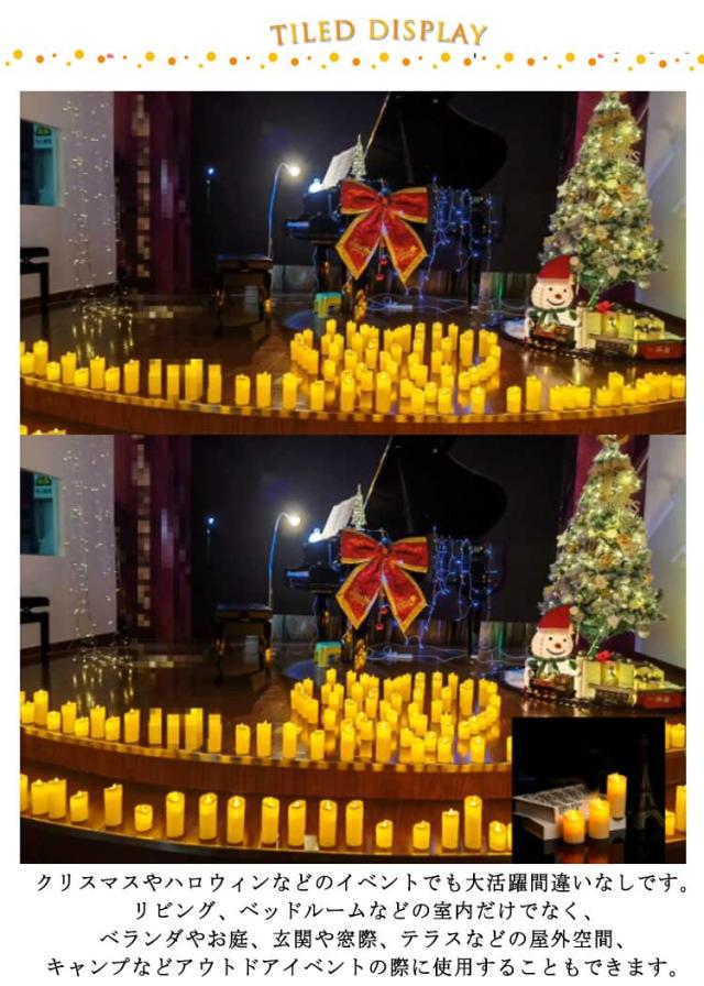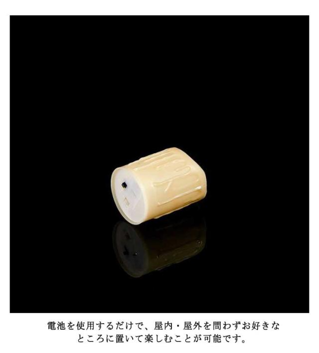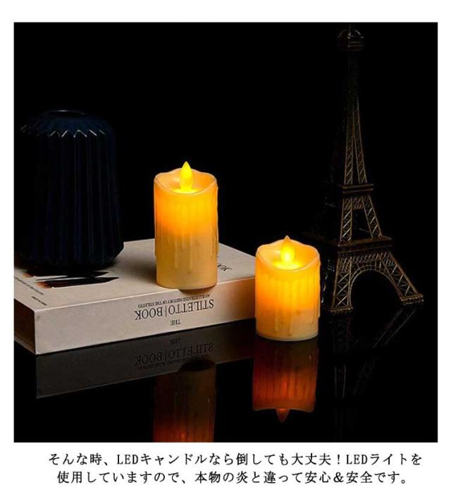 | まるで本物のような炎の揺らぎ!ロウソク型LEDライト。【3個セット】 本物の蝋燭の炎のような揺らめきに限りなく近い『ゆらぎ』を再現しています。 本物の炎だと誤って倒してしまったり、お部屋の中ではちょっと心配です。そんな時、LEDキャンドルなら倒しても大丈夫!LEDライトを使用していますので、本物の炎と違って安心&安全です。 クリスマスやハロウィンなどのイベントでも大活躍間違いなしです。 リビング、ベッドルームなどの室内だけでなく、ベランダやお庭、玄関や窓際、テラスなどの屋外空間、キャンプなどアウトドアイベントの際に使用することもできます。 ほんのりと優しい明かりですので常夜灯としてもお勧めです。 電池を使用するだけで、屋内・屋外を問わずお好きなところに置いて楽しむことが可能です。 | |