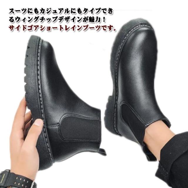 | スーツにもカジュアルにもタイプできるウィングチップデザインが魅力!サイドゴアショートレインブーツです。 定番人気のサイドゴアタイプで脱ぎ履きもしやすく足にフィットして歩きやすい!一体成型の完全防水なので靴の中に水が入らず大雨でも安心! 適度なクッション性のインソールは取り外しもでき、清潔。 防滑ソールで滑りにくく、機能性もバツグンの優秀アイテムです。 | |