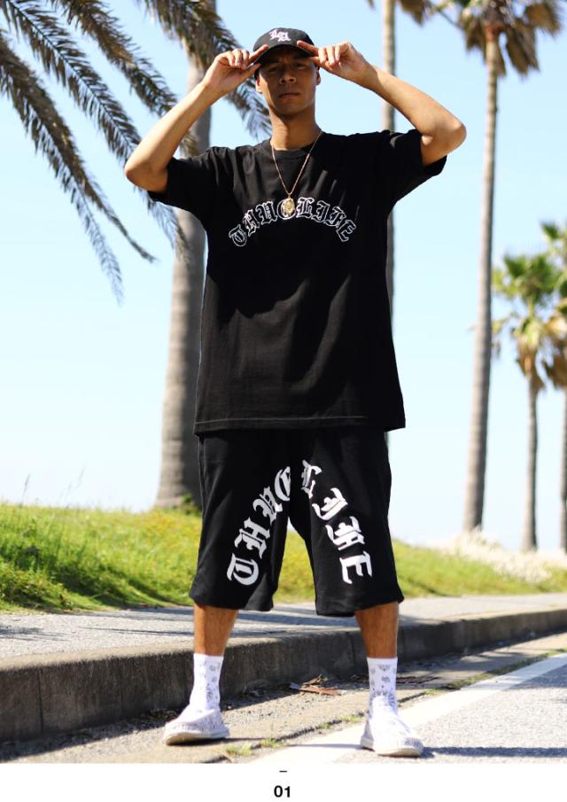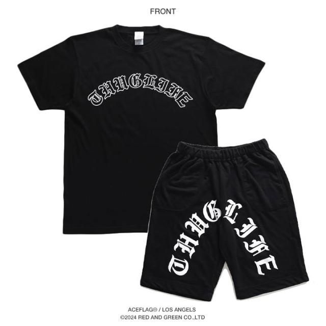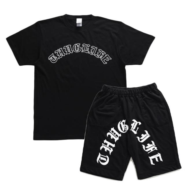 オールド文字の「THUG LIFE」をドロップした、Tシャツとスウェットハーフパンツの上下セット。