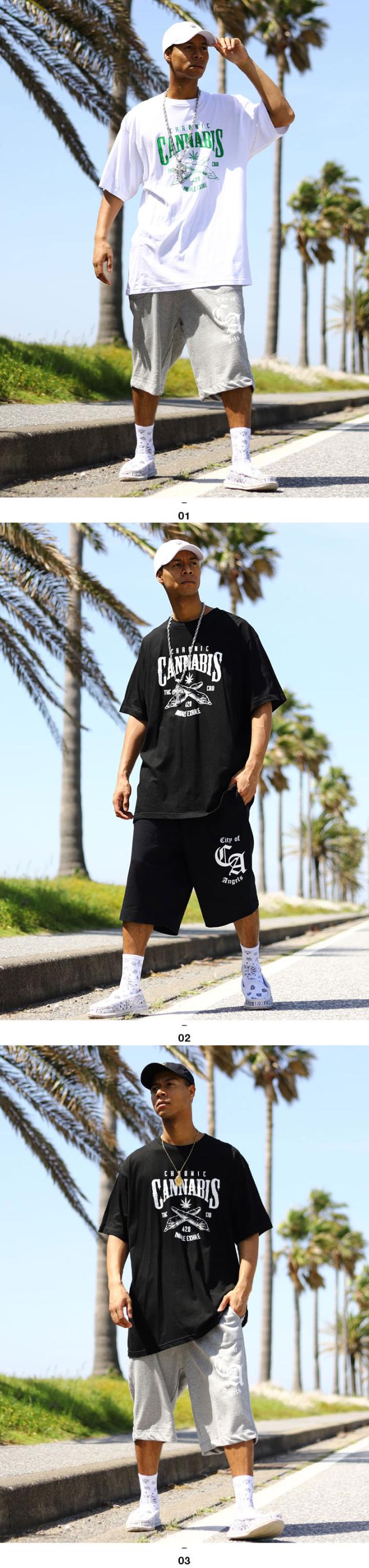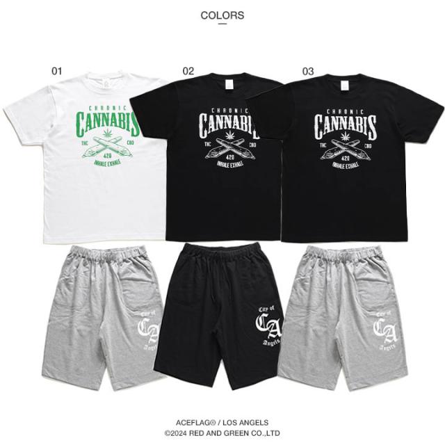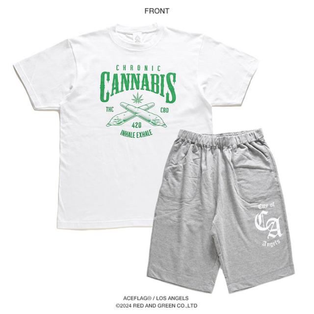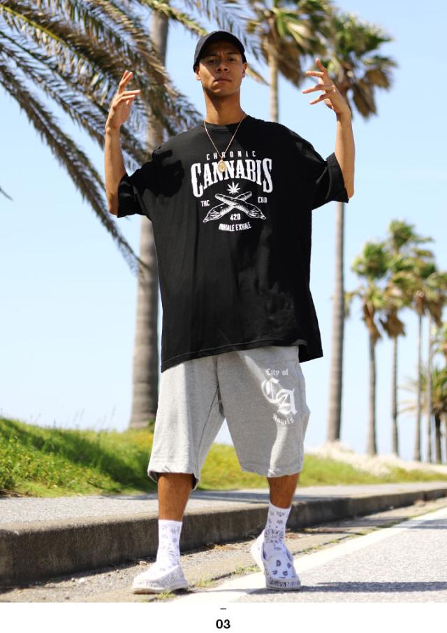 ヘンプに関するワードやモチーフをドロップしたTシャツとカリフォルニア州の略称の「CA」をドロップしたスウェットハーフパンツの上下セット。