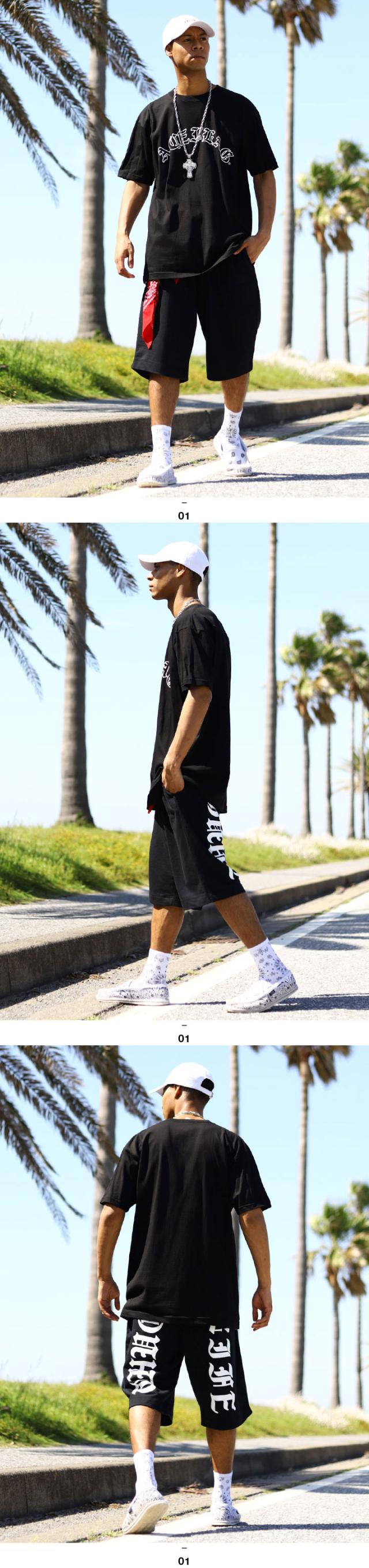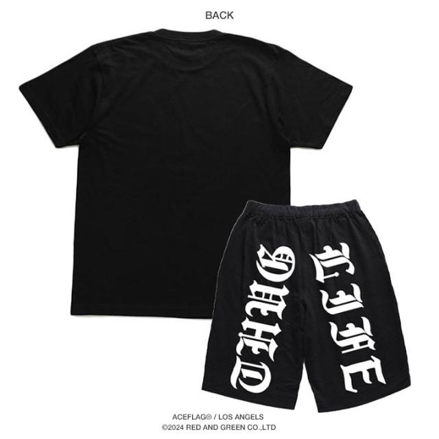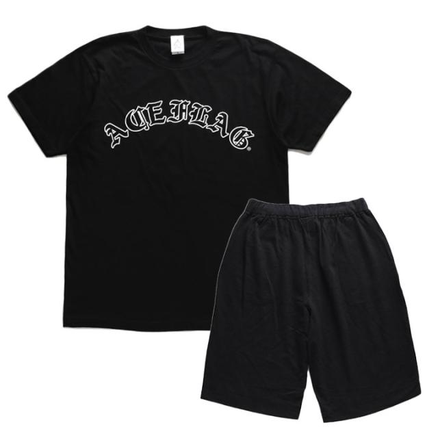 ブランドロゴの「ACE FLAG」をLAtimes風の伝統的なオールド文字でドロップしたTシャツと「THUG LIFE」をドロップしたスウェットハーフパンツの上下セット。
