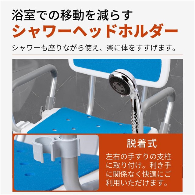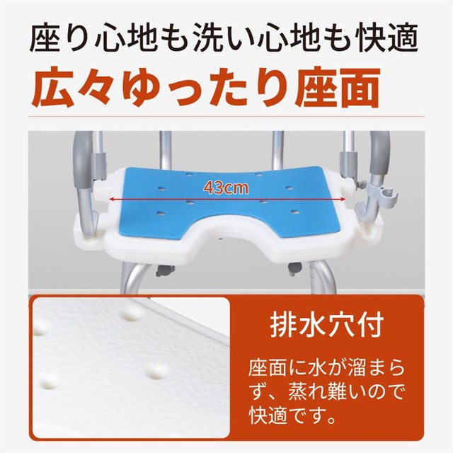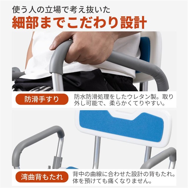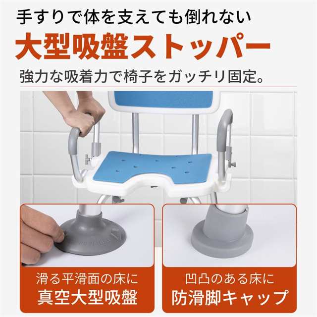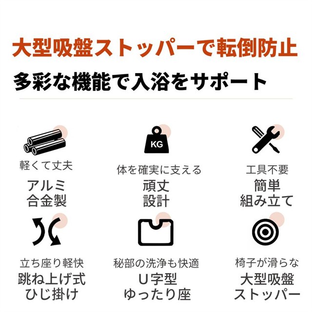 - このシャワーチェア、安定性や高さ調節機能、立ち上がり補助などの実用性抜群。耐荷重が180kgと頑丈でありながら軽量で扱いやすい点も評価する。大型吸盤による滑り止め設計が安全性を高めているのもポイント。