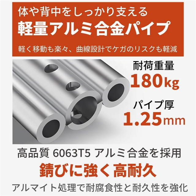 ・強固なアルミ合金フレーム:耐荷重量180kgでしっかりとサポート。